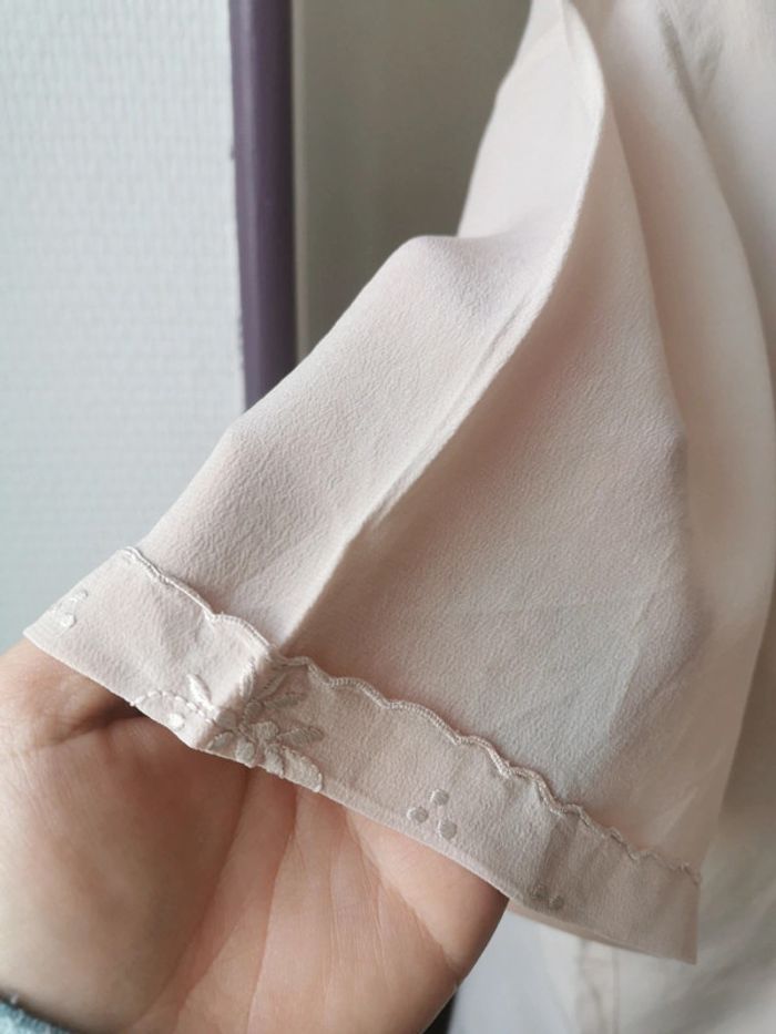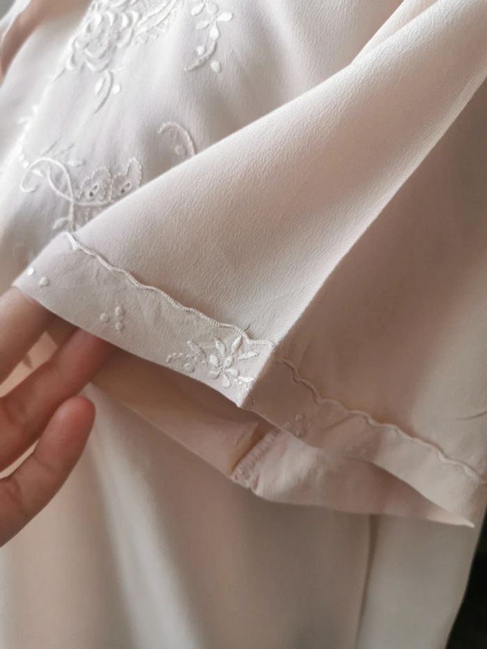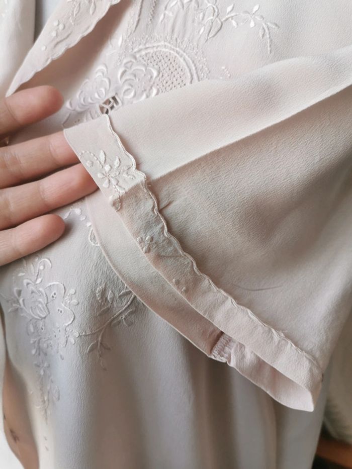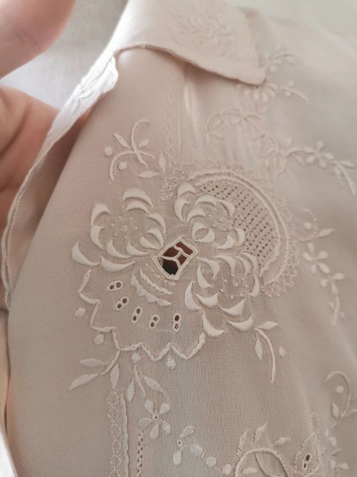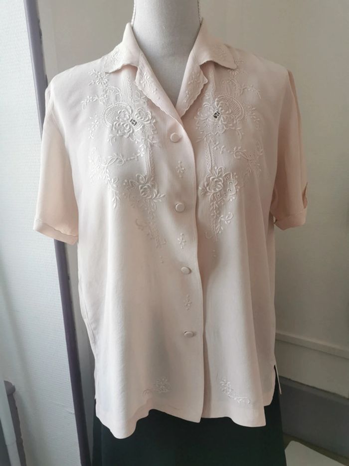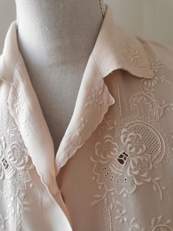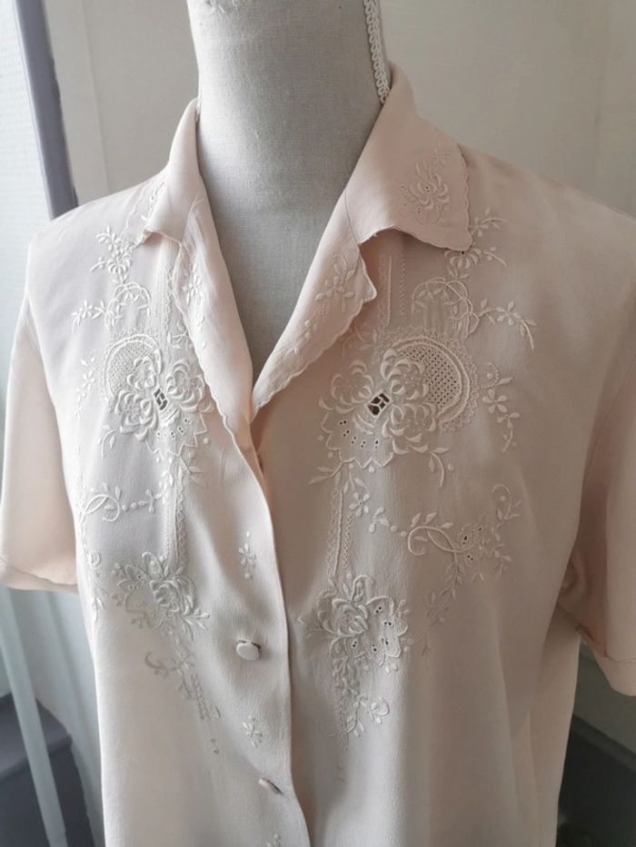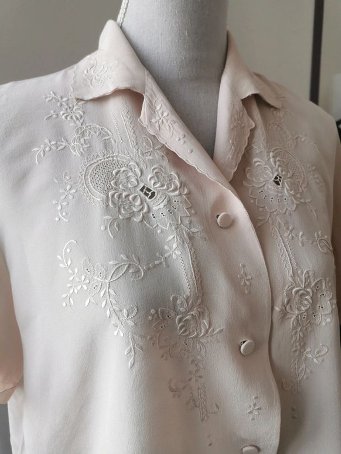 Magnifique blouse chemise année 60s top pura seta Chemisier manches courtes 100% pure soie Avec dentelle ajourée brodée main + dessins brodés main Couleur rose poudrée