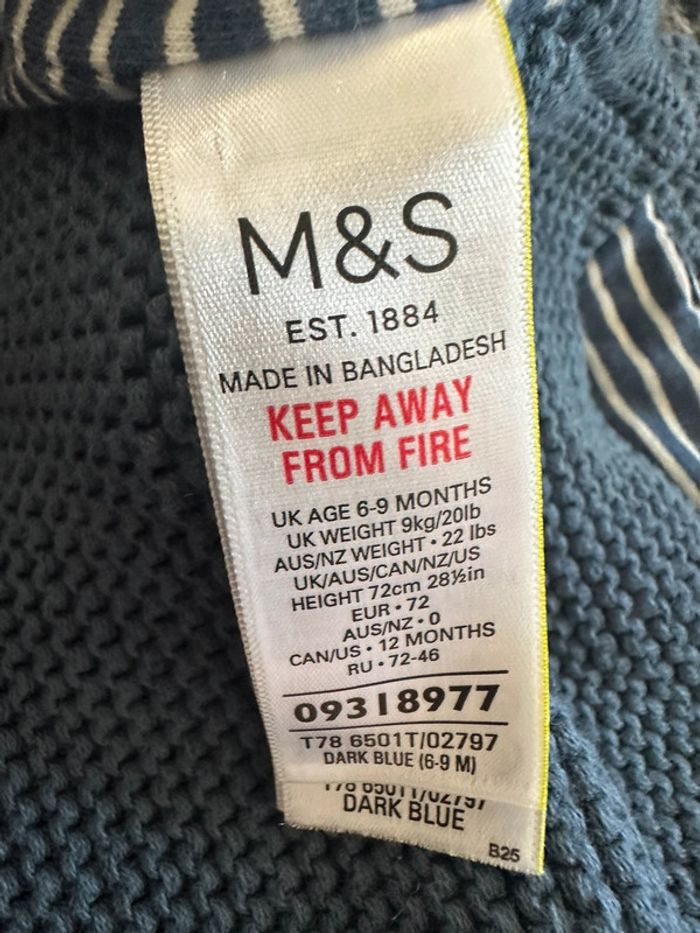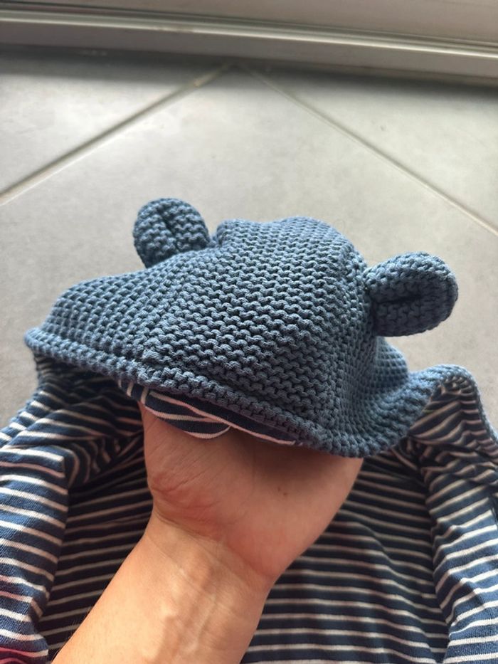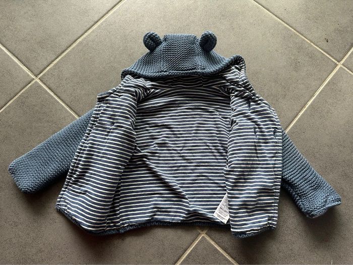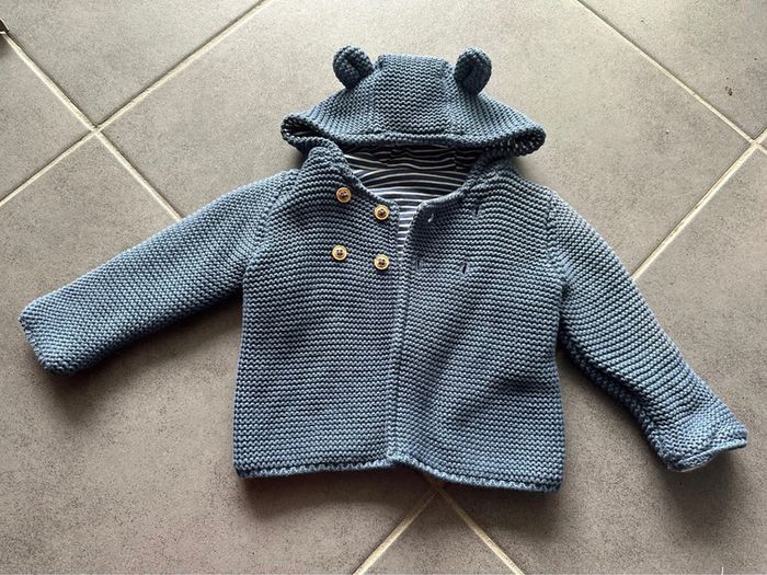 Gilet en grosse maille bleu Capuche avec oreilles de nounours Se ferme avec 4 boutons Intérieur rayé Taille 6-9 mois