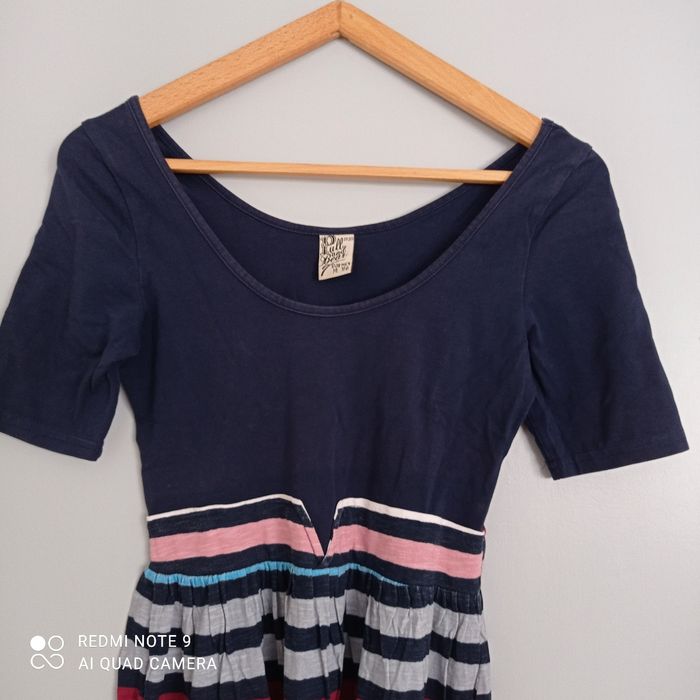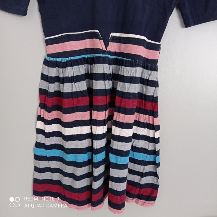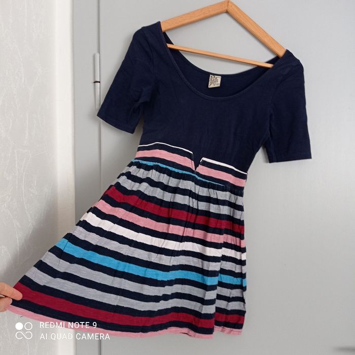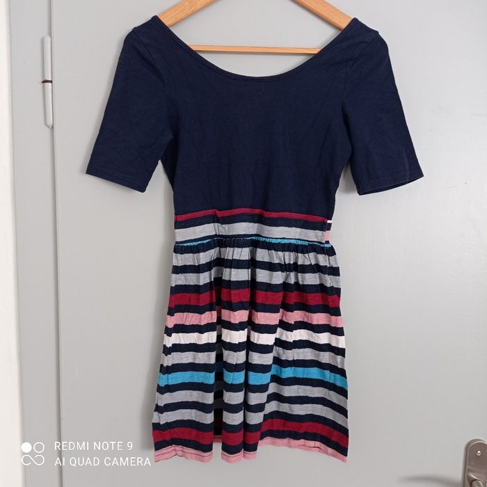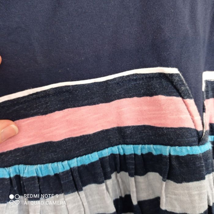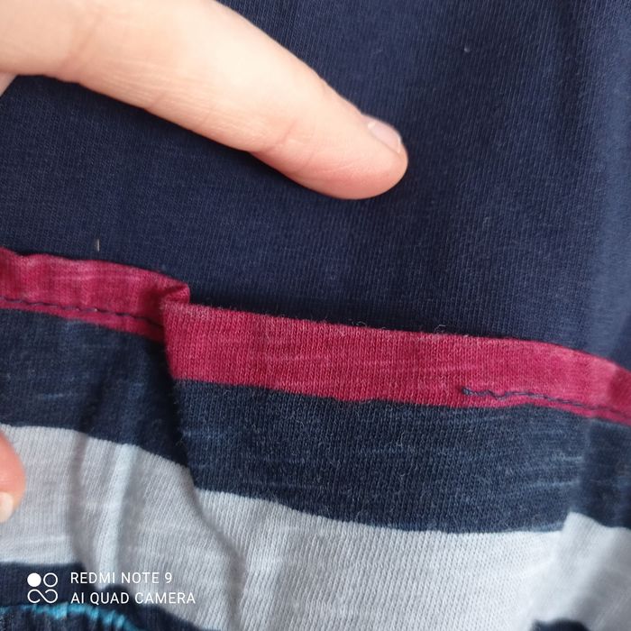 Rayures horizontales multicolores. Un ou deux endroits où les surpiqûres sont manquantes.