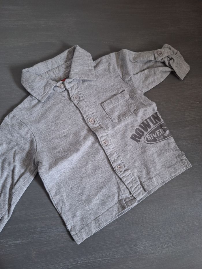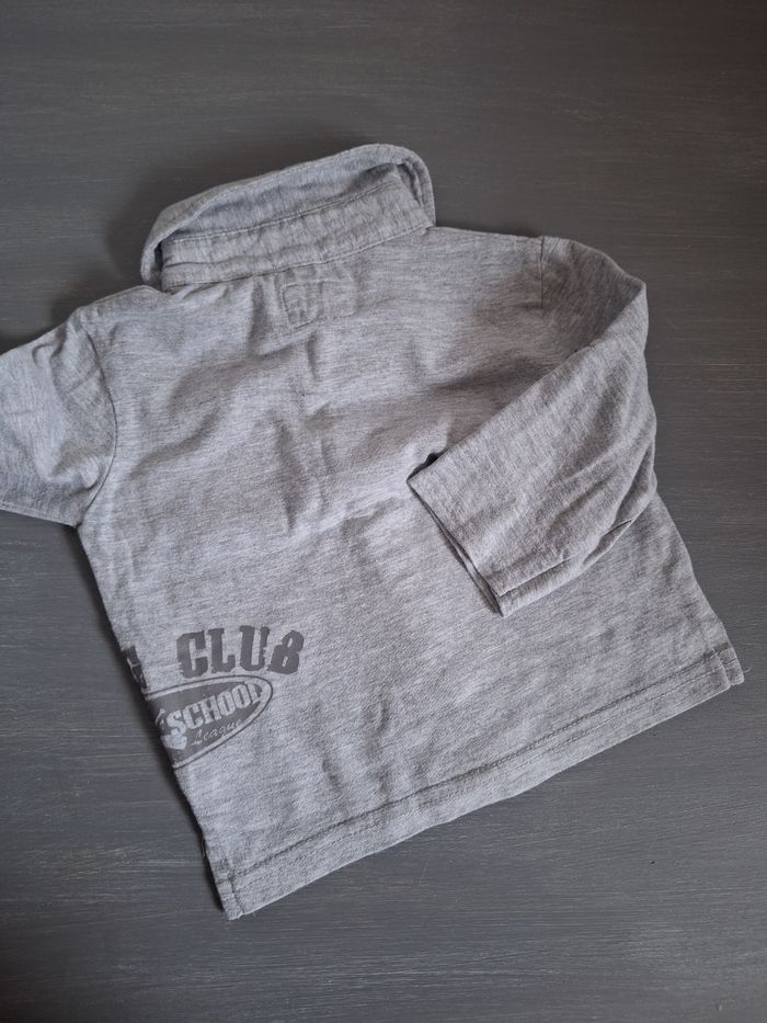 GARÇON 9 MOIS N°749 Polo lm Gris clair ,imprimé Bouton devant Possibilité manche retroussé 95% coton 5% viscose Taille 9 mois River school 2,50€ #kelly_garçon9mois