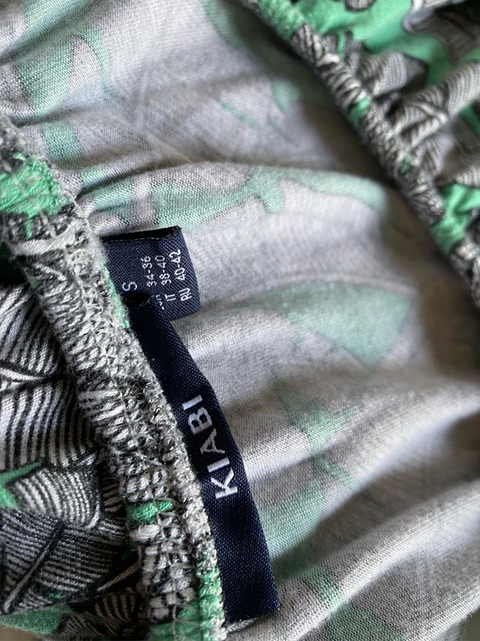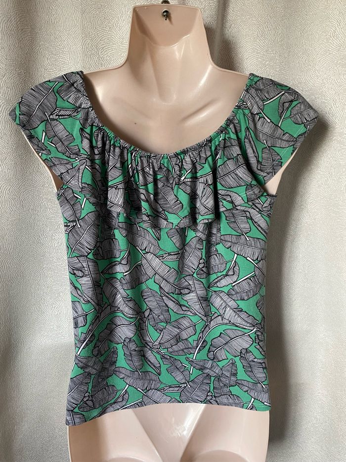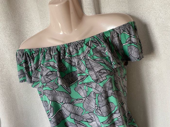 T-shirt vert imprimé plumes noir et blanc Volant élastique à l’encolure pour épaules découvertes Taille S Kiabi Pas de trou ni tâche Aisselle à aisselle sans tirer 47 cm Longueur côté 35,5 cm Longueur milieu devant 44 cm Le volant ( niveau élastique) mesure à plat 35 cm sans tirer , va jusqu’à 80 cm à plat en tirant