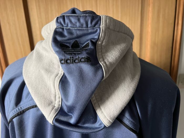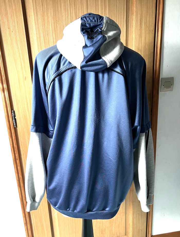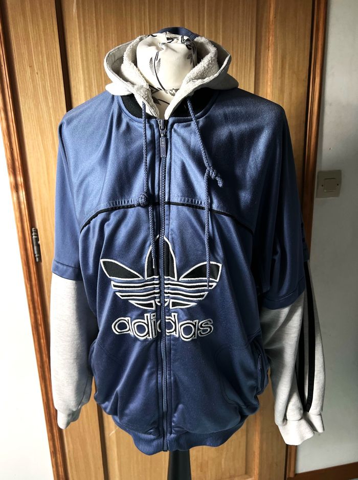 Marque "Adidas", polyester et coton épais. 2 poches fermées par zip devant, Fermeture par zip, cordons de serrage pour la capuche. Tour de poitrine 132 cm, longueur 70 cm.