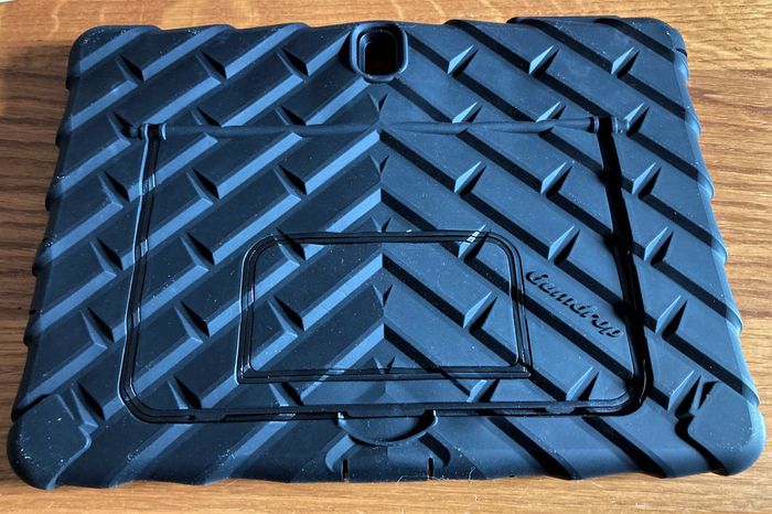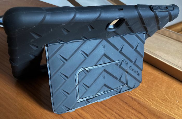 Marque "Gumdrop cases", coque antichocs robuste avec protecteur d'écran Intégré et béquille. Gamme 2019. Dans son emballage, pas utilisée (changement de tablette). Dimensions de la coque : longueur 25 cm, largeur 18 cm, épaisseur 2 cm.