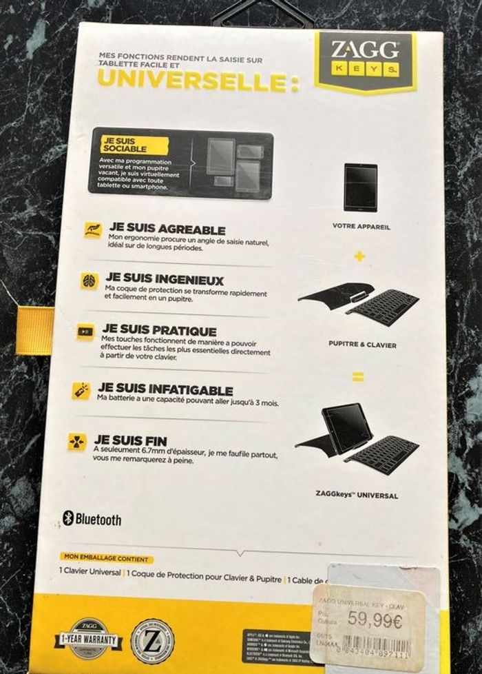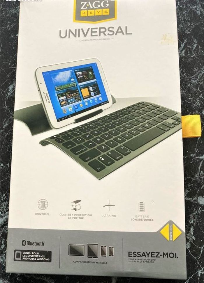 Conçu pour système Androïd et Windows, marque ZAGG. Neuf, jamais servi. Vendu avec sa boîte d'origine. Longueur 24.5 cm x largeur 12.5 cm x épaisseur 6.5 mm.