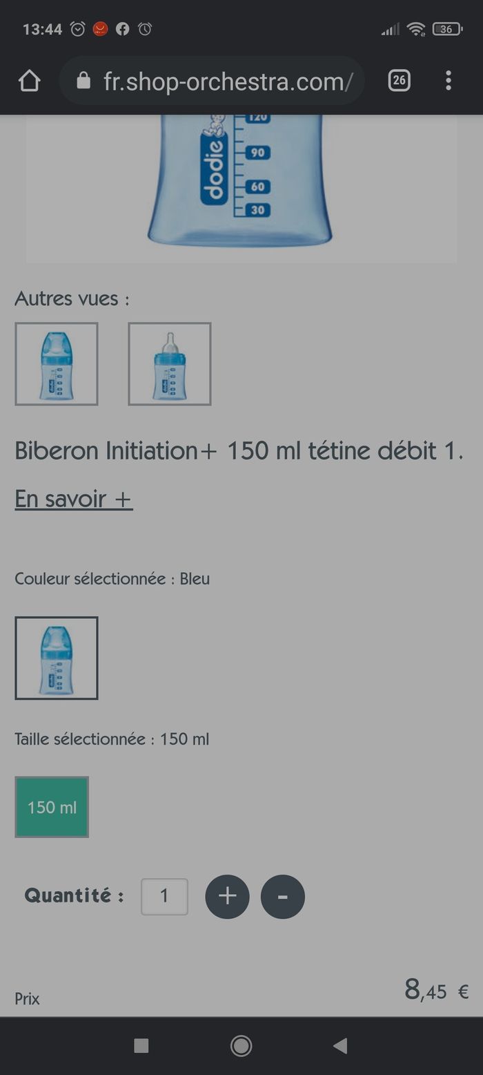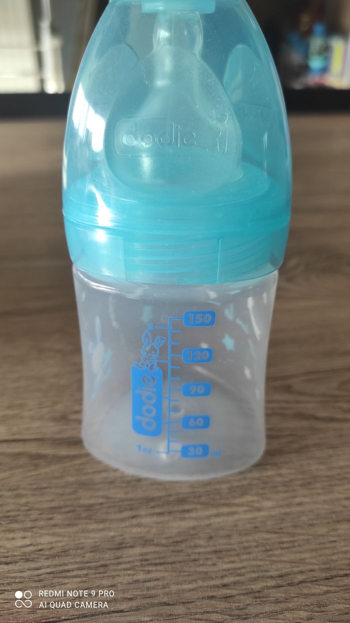 Bonjour vend biberon dodie neuf 150 ml DESCRIPTION Biberon Initiation+ 150 ml tétine débit 1. Le premier biberon idéal. Caractéristiques : - Col large pour un remplissage et un nettoyage facilités. - Biberon doté d’une tétine ronde 3 vitesses avec une valve brevetée : anti-colique, anti-régurgitation, anti-aerophagie. - Design exclusif, forme triangulaire conçue pour la main de bébé et de maman. - Capuchon ergonomique anti-fuite. - Bague de serrage pour réguler l’entrée d’air. - Graduation adaptée aux mesures de lait. - Base évasée pour une meilleure stabilité. - 0% BPA et 0% BPS. - 100% fabriqué en France.