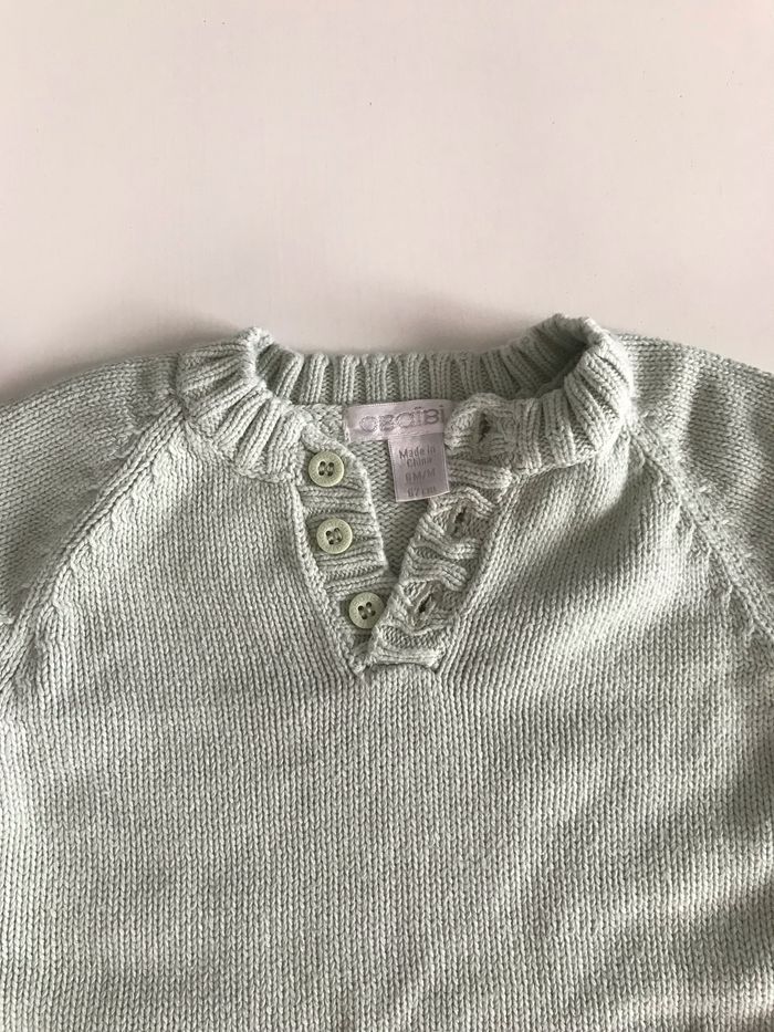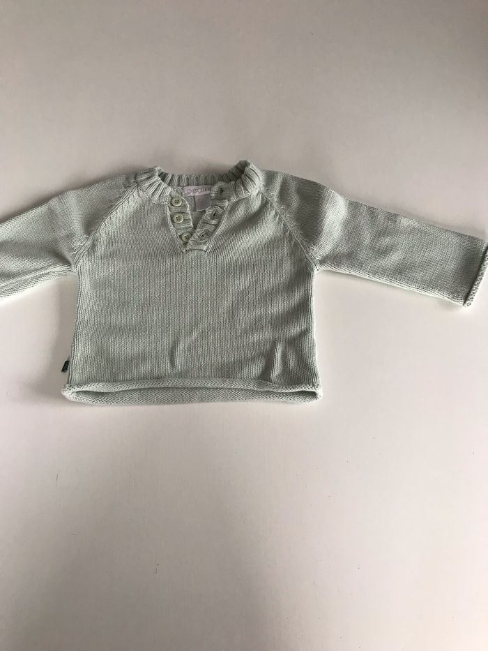 Pull bébé fille vert clair, col V avec boutons. 100% coton. Marque Obaibi. 6 mois