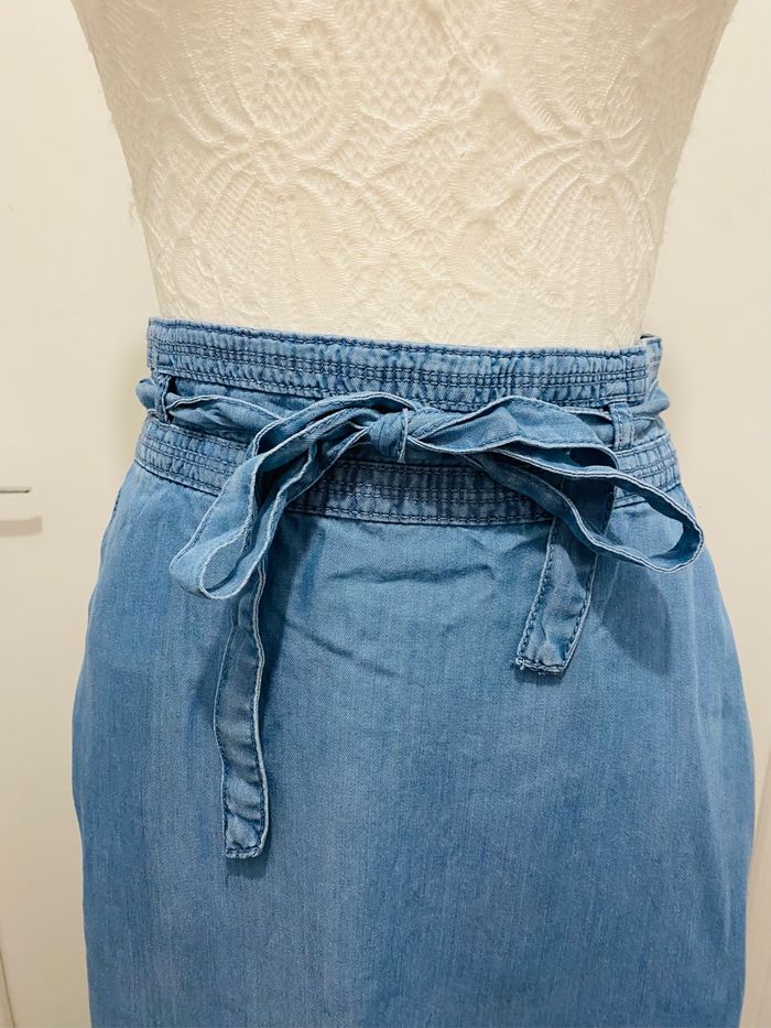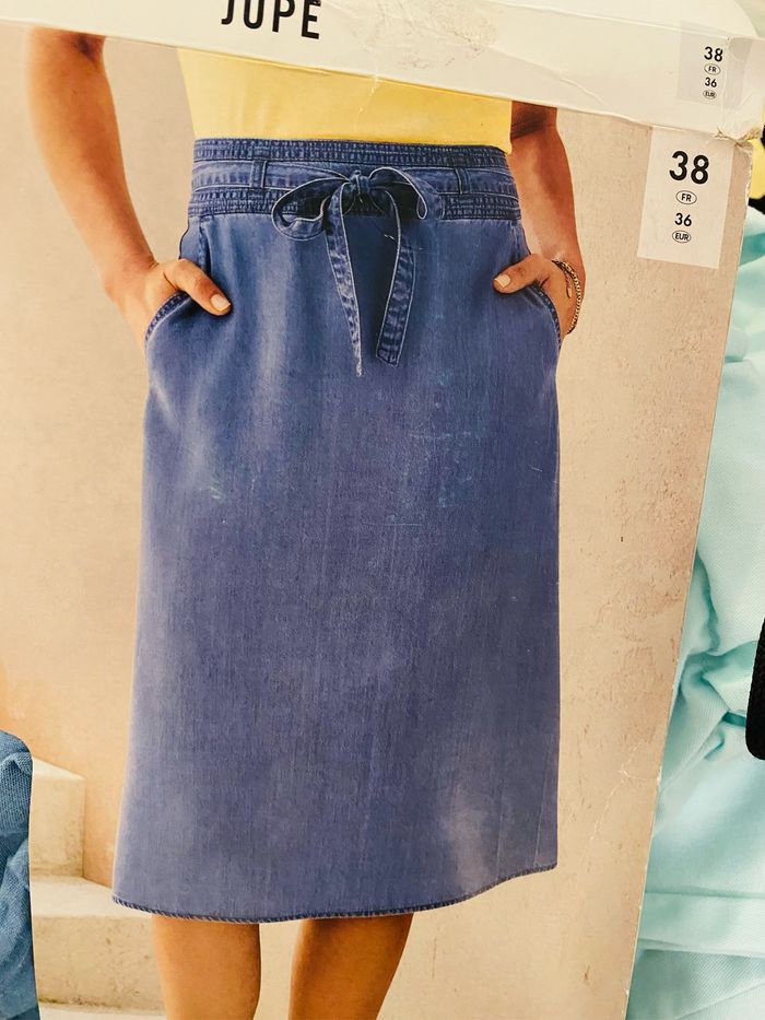 jupe mi-longue neuf T38 longueur 71 cm couleur effet jean avec poche et noeud à la taille Fermeture au dos