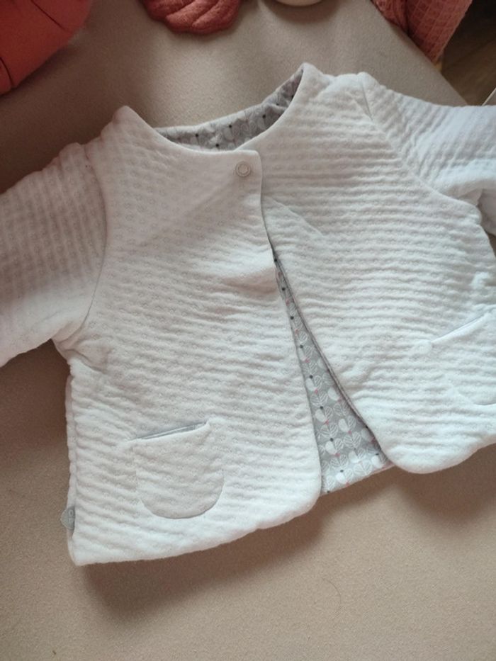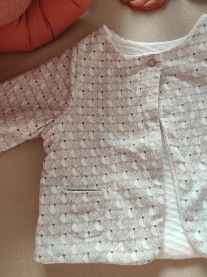 Ensemble composé : -une veste réversible avec poche des deux côtés -un short réversible -une body rose pâle avec un col Claudine Très bon état Taille 6 mois
