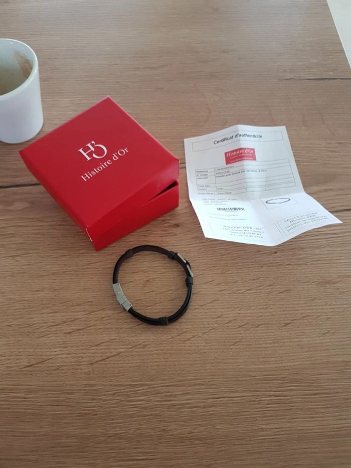 Bracelet comme neuf, en acier, en cuir noir tressé 19,50 cm. Vendu avec la boîte et le certificat d'authenticité.