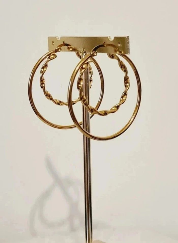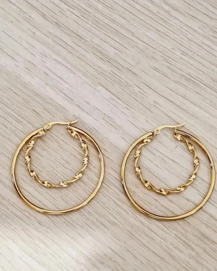 Créoles NEUVES doubles cerceaux en acier inoxydable couleur or Anneau lisse : 4 cm - anneau torsadé : 2 cm Hypoallergénique, ce bijou résiste à l'eau 💧ne rouille pas ne noircit pas✅️ Facture jointe à votre achat, vendeur pro ✨️pochette cadeau offerte 🎀 #bijou #doré #acierinoxydable #stainlesssteel #bouclesdoreilles