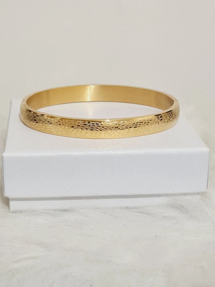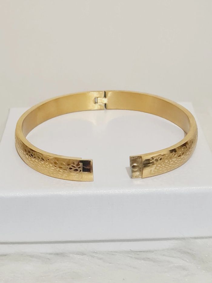 Bracelet jonc NEUF en ACIER INOXYDABLE couleur or ciselé, largeur 8 mm, diamètre 6,5 cm, ouverture sur le côté, idéal poignet inférieur à 17 cm Hypoallergénique ✨️ ce bijou résiste à l'eau 🏊 ne rouille pas ne noircit pas 🌊✅️ Facture jointe à votre achat📗 pochette cadeau offerte 🎀 #bracelet #doré #acierinoxydable #stainlesssteel #bijou #bijoux #bijouxdoré #gold #mode #tendance #accessoire
