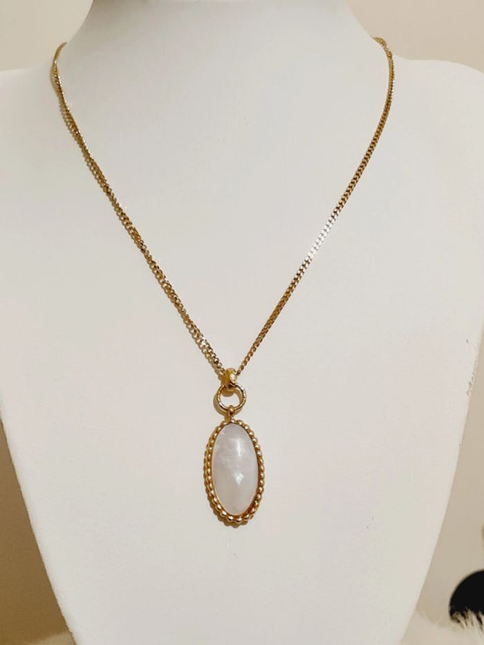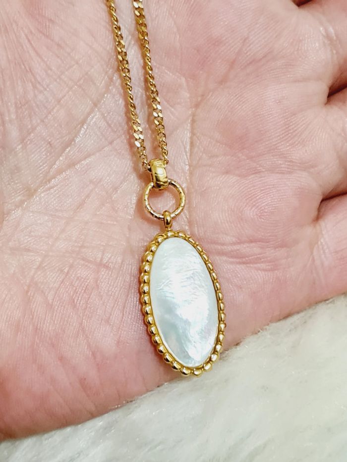 Collier NEUF marquise à pierre naturelle ovale de nacre en acier inoxydable couleur or Longueur : 39 cm + 5 cm de chaînette d'extension ajustable Pendentif : 2,5 × 1,5 cm Hypoallergénique ✨️ ce bijou résiste à l'eau 🏊 ne rouille pas ne noircit pas 🌊✅️ Facture jointe à votre achat📗 pochette cadeau offerte 🎀 Retrouvez la bague assortie dans mon dressing 🥰 La nacre blanche : un doux miroir irisé qui veille sur nousEn lithothérapie, cette pierre est aussi prisée pour ses vertus d'apaisement, aidant à calmer les émotions, tout en stimulant l'imagination et l'intuition. Comme une douce maman, ses lumineux reflets irisés nous enveloppent de sérénité et de bien-être. #collier #nacre #doré #acierinoxydable #stainlesssteel #saintvalentin #pierre #pierrenaturelle #bijou #bijoux #mode #tendance #accessoire