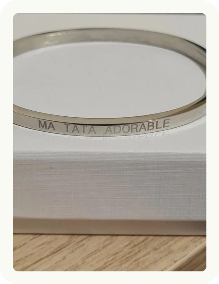 Bracelet NEUF jonc ovale en acier inoxydable / Stainless Stell, ouverture et fermeture sur le côté par clip très fin 0,4 mm Gravure MA TATA ADORABLE des 2 cotés et gravure S.Steel à l'intérieur Idéal pour poignet jusqu'à 17 cm maximum Hypoallergénique, ce bijou résiste à l'eau 💧ne rouille pas ne noircit pas ✅️ Pochette organza offerte 🎁 Facture jointe, vendeur pro 🌹 #bijou #bijoux #argenté #bracelet #acierinoxydable #stainlesssteel #mode #tendance #accessoire