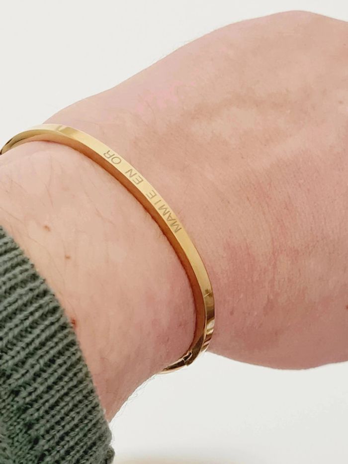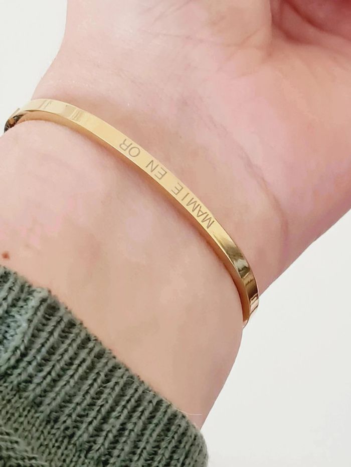 Bracelet jonc ovale NEUF en acier inoxydable / Stainless Stell, très fin, 0,4 mm, ouverture et fermeture sur le côté par clip Gravure MAMIE EN OR des 2 cotés et gravure S.Steel à l'intérieur Idéal pour poignet de jusqu'à 17 cm Hypoallergénique, ce bijou résiste à l'eau 💧ne rouille pas ne noircit pas ✅️ Livré dans une pochette cadeau 🎁 Facture jointe, vendeur pro 🌹 N'hésitez pas à visiter mon dressing, ce bracelet existe aussi en couleur argentée et or rose🥰 #bracelet #doré #bijou #acierinoxydable #stainlesssteel #mère #mamie #fêtes #fêtedesgrandsmeres