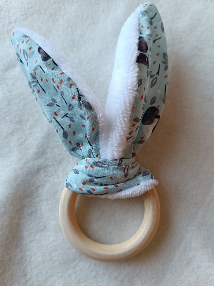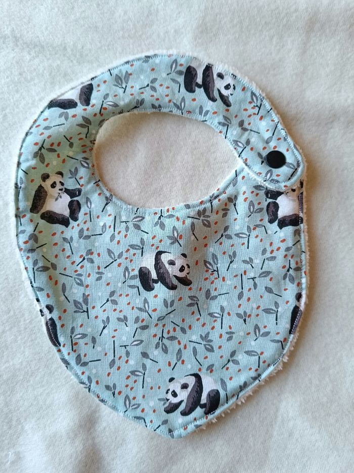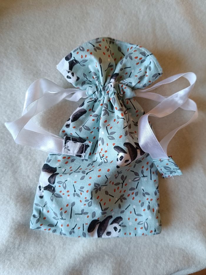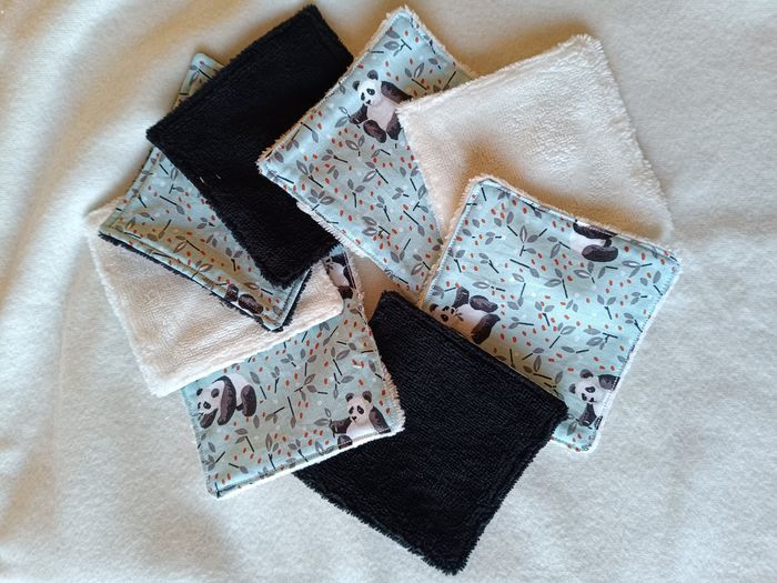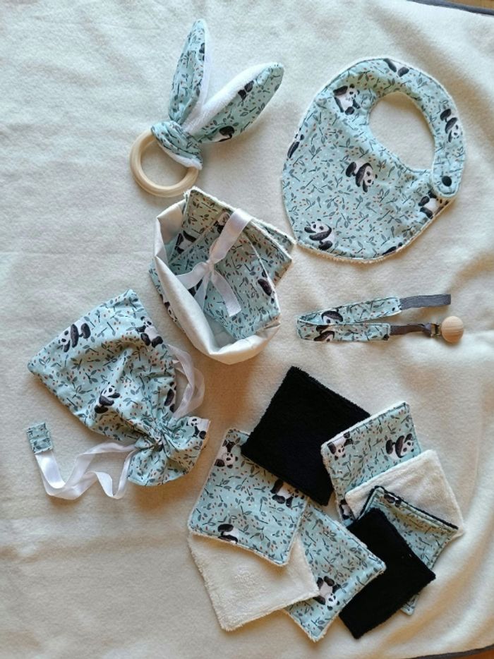Lot neuf composé de 11 lingettes, panière, attache tétine, bavoir, anneau dentition oreilles de lapin, pochon. Motif panda . Tissus éponge bambou oeko-tex.