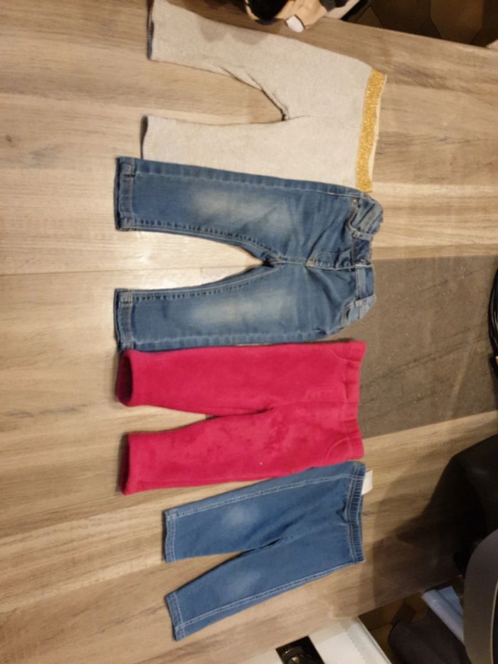 1 legging gris petit bateau 1 Jean bleu tape a l'œil 1 polaire rouge orchestra 1 jogging bleu sans marque #bebefille12moisclo