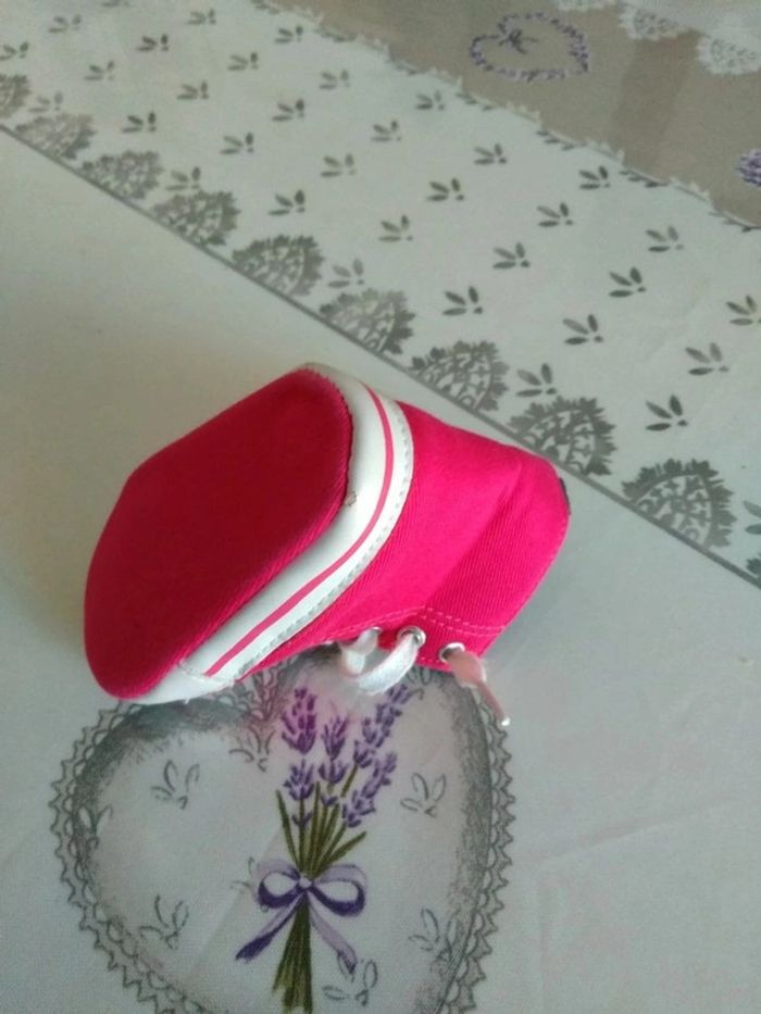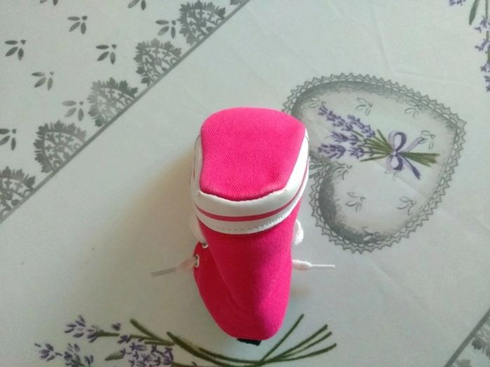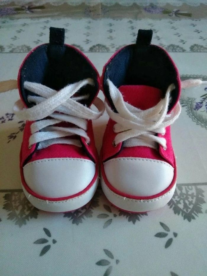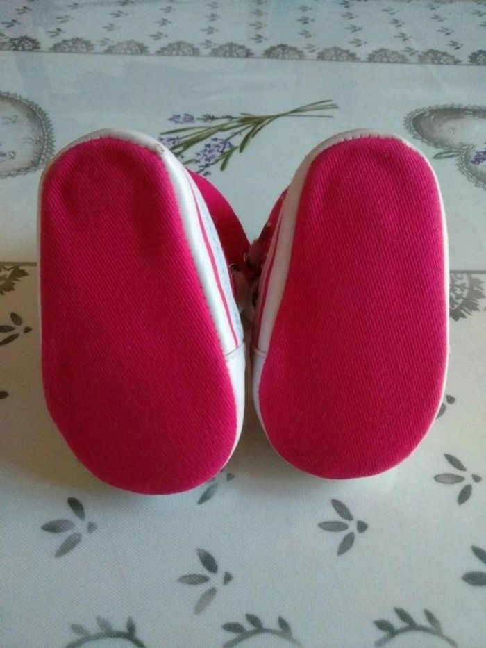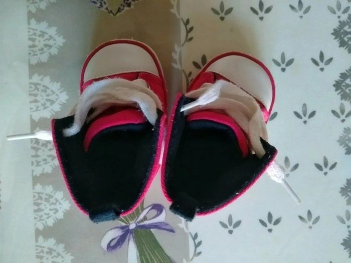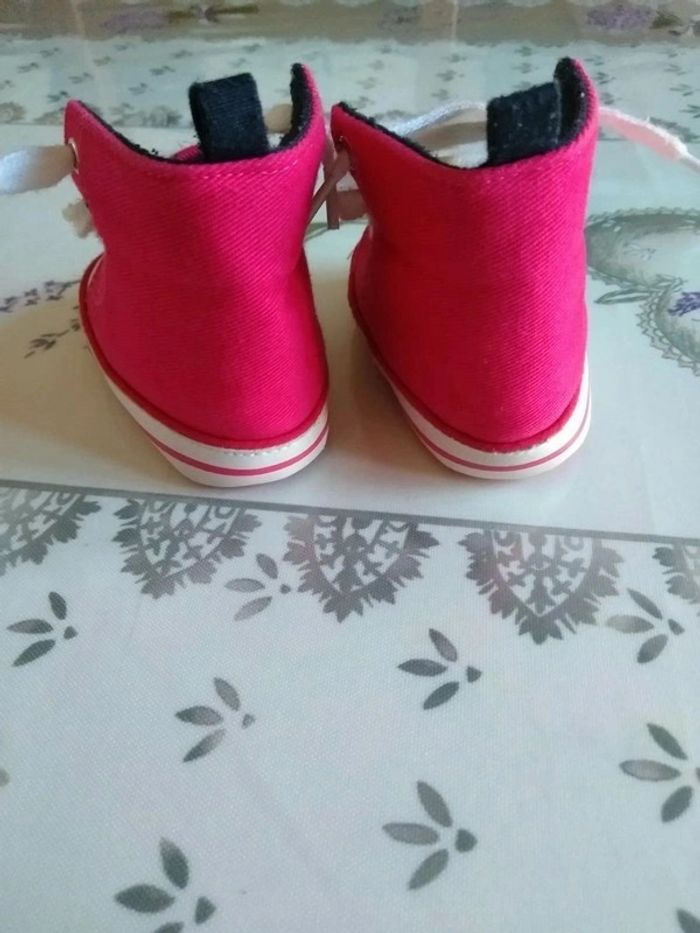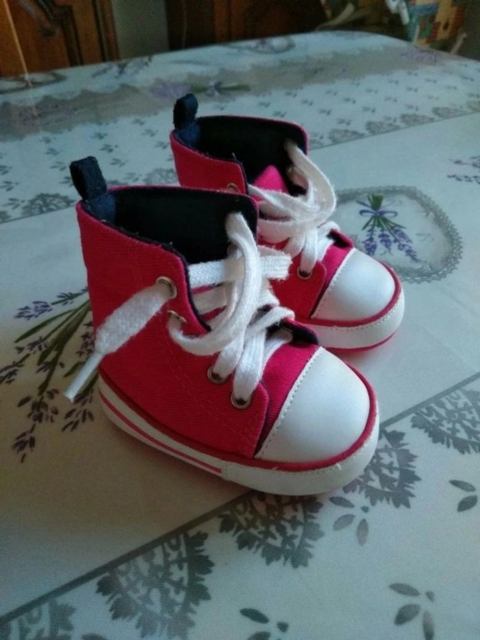 Chaussure bébé "style converse haute" en très bonne état, il n'y a pas de tâches. Deux petits frotement léger sur le bas derrière d'une chaussure, voir photos