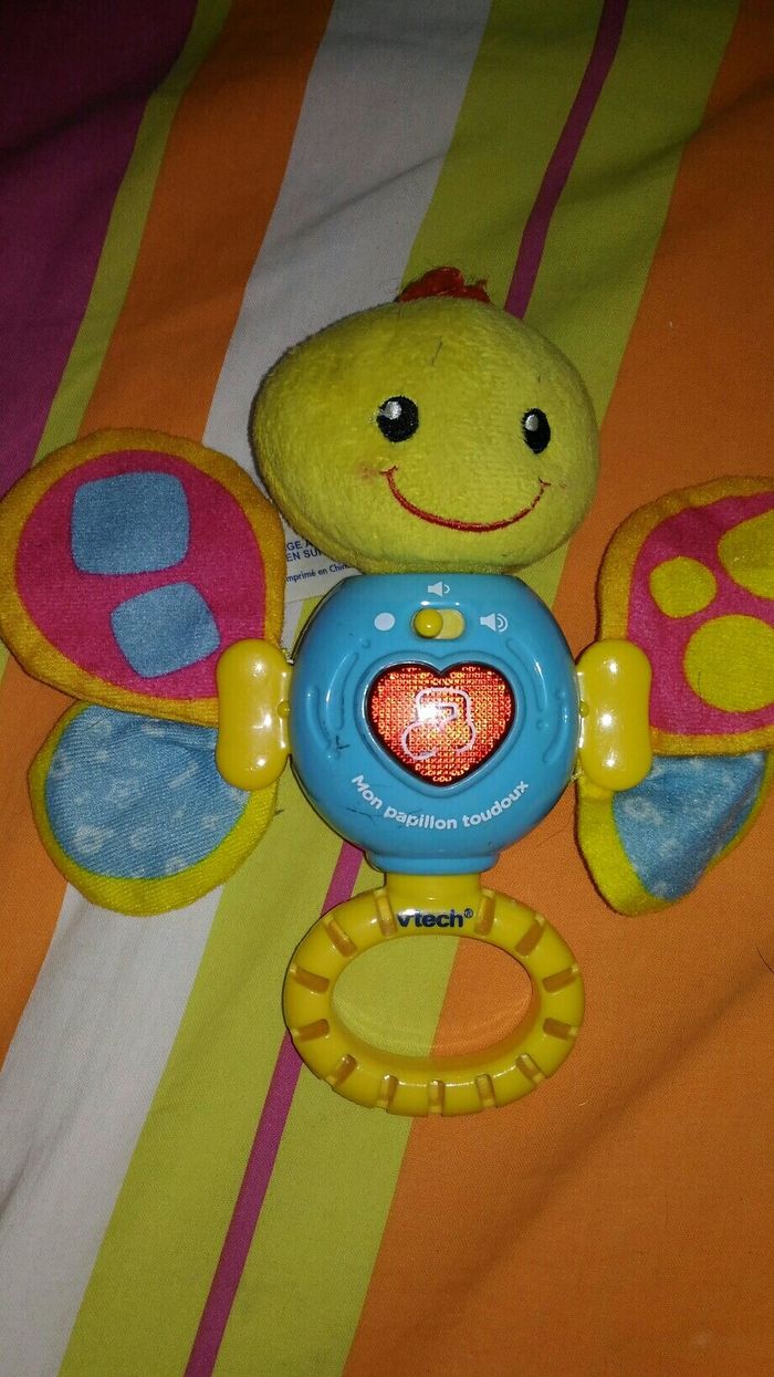 Mon papillon Toudoux VTECH De 6 à 24 mois Un hochet parlant, musical et lumineux en forme de papillon pour découvrir les premiers chiffres, les formes et les couleurs. Des jeux de textures: la tête du papillon est en tissu tout doux et ses ailes en tissu bruissant. Quand bébé secoue le hochet, il déclenche des mélodies et des effets sonores amusants. Une touche note de musique en forme de coeur clignote, déclenche des effets sonores, des mélodies et une chanson. En manipulant les ailes du papillon, bébé déclenche 4 mélodies et une chanson