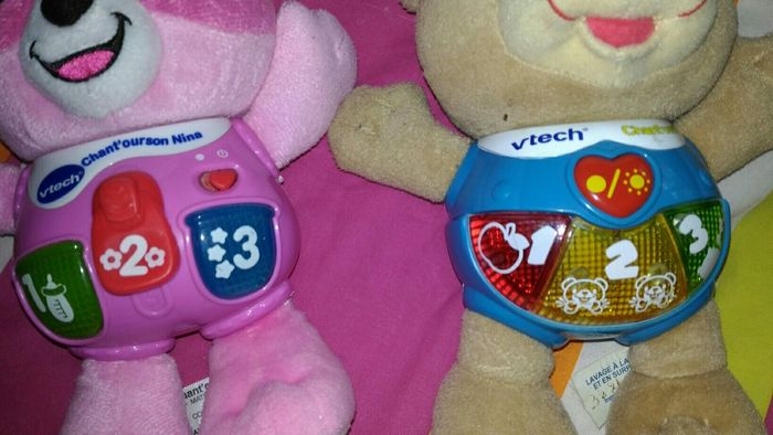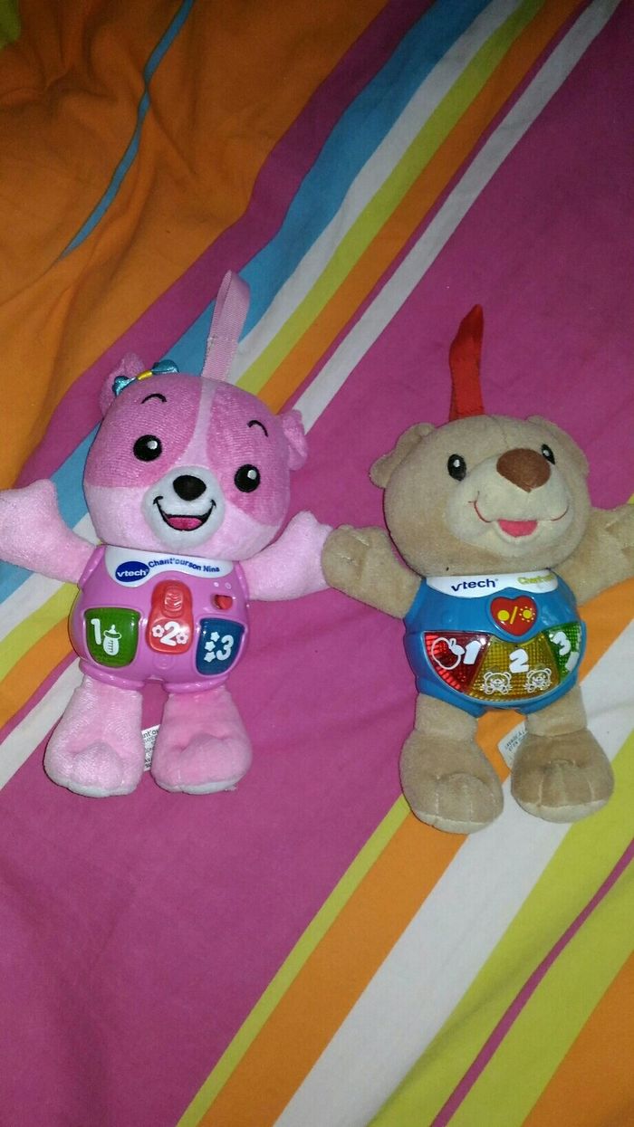 Chant ourson bleu et rose nina vtech Le bleu fonctionne Le rose fonctionne de temps en temps à voir pour bricoleur 15€ le bleu 8€ le rose