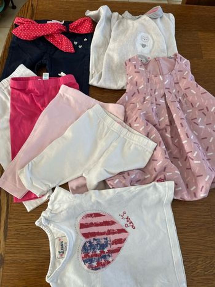 Lot de 8 articles pour bébé de 6 mois comprenant : 4 leggings + un pantalon + une jolie robe bouffante +une grenouilliere+un tee-shirts à manches longues ( Lévis) . Le tous en très bon état.