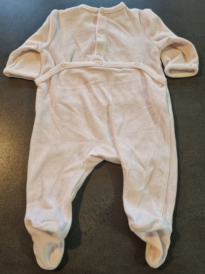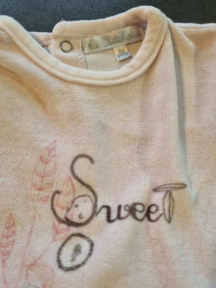 Pyjama velours rose pâle Kitchoun 6 mois Très bon état Possibilité de faire un lot. N'hésitez pas si questions ou besoin d'autres photos.