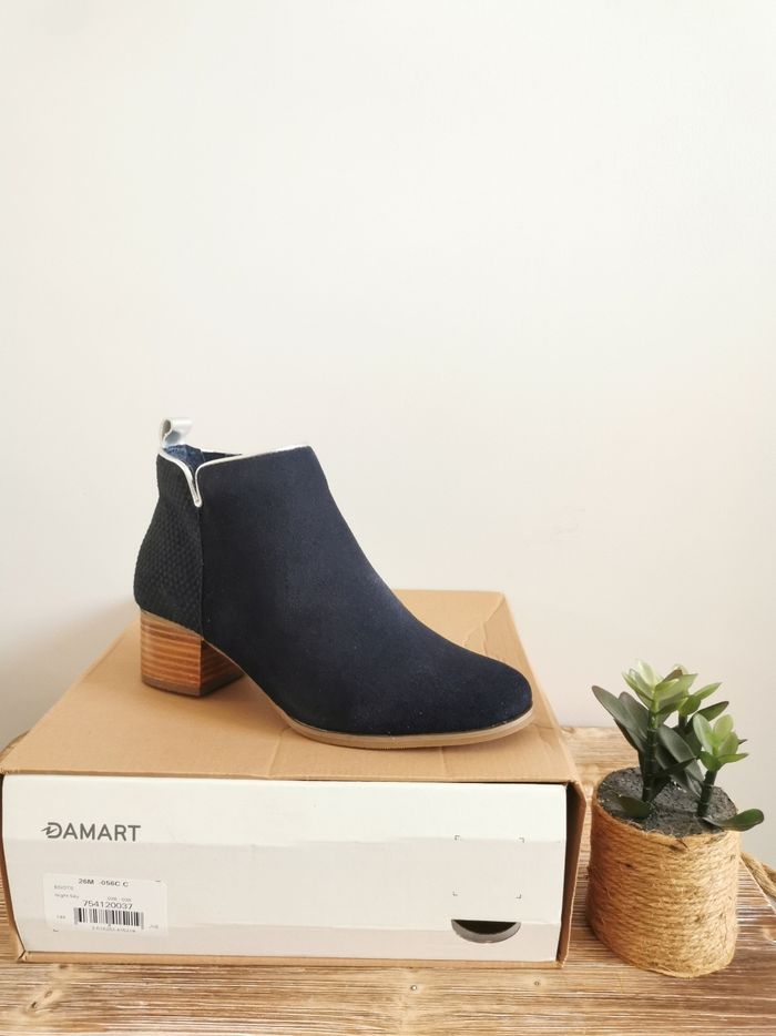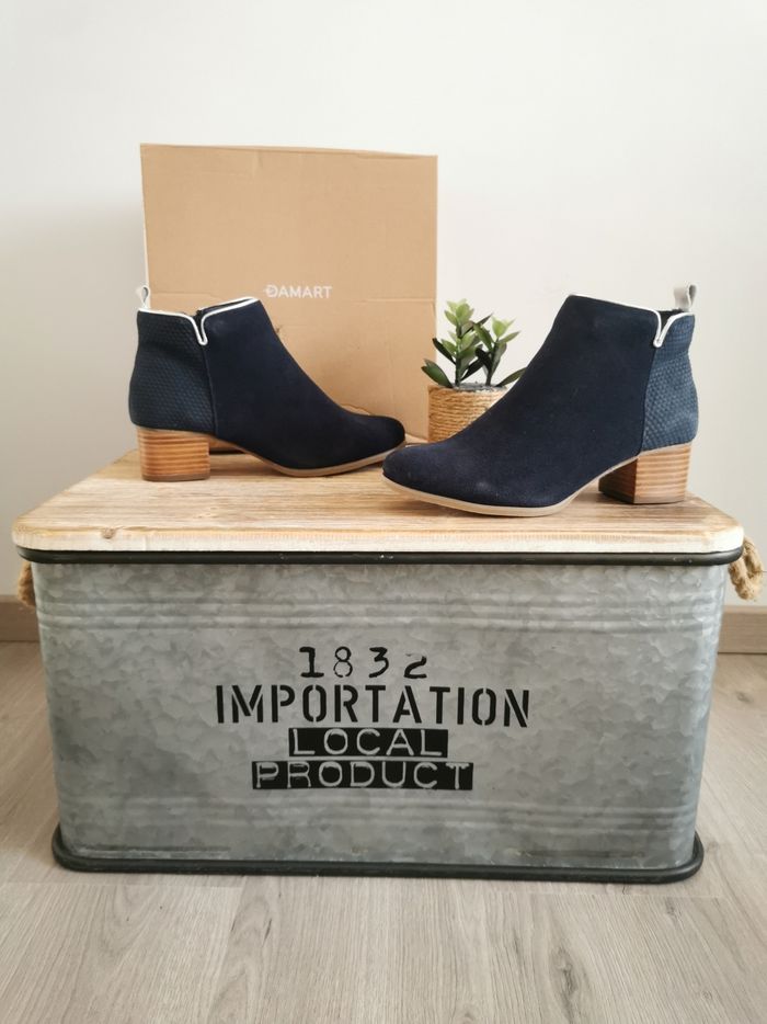 👟ETAT DE L'ARTICLE: 10/10 ✅️ Sans étiquette - Jamais portées Avec boîte d'origine 📦 (Boîte légèrement abîmée, voir dernière photo 📷) Bottines bi-matières bleu marine 🔵 Damart 👩 👣 Pointure 38 👣 • Matière: Cuir - Croûte de cuir vachette 🐄 • Dessus avec traitement déperlant ☔️ • Semelle intérieure en cuir avec soutien plantaire • Découpe fantaisie souligné d'un liseré argenté sur le haut de la tige • Fermeture zippée sur le côté pour un enfilage facile • Hauteur Talon 👢: 5 cm 📏 💰Prix boutique: 99.99€ 🟪
