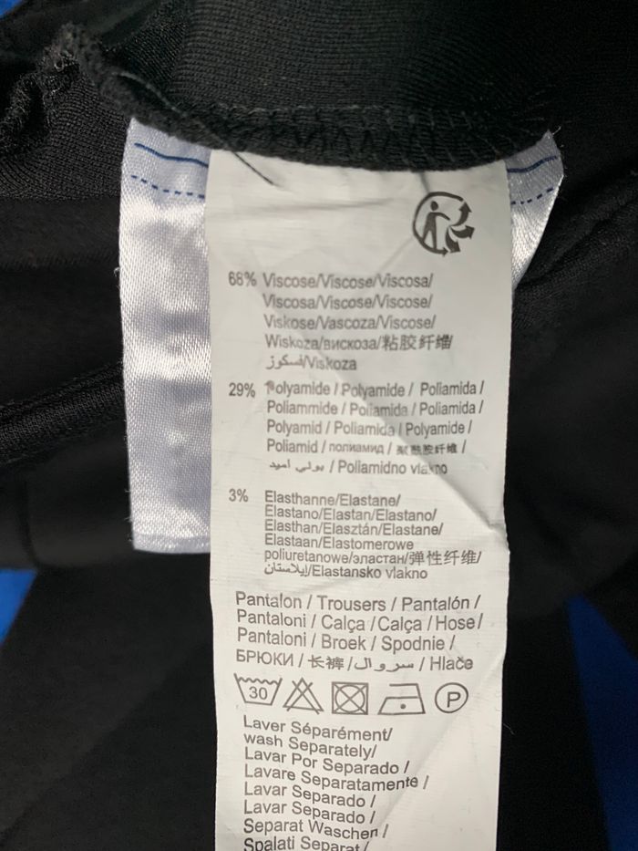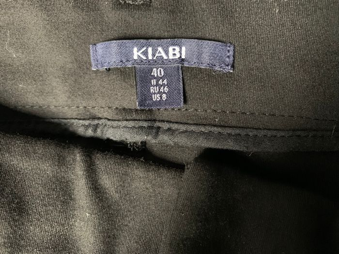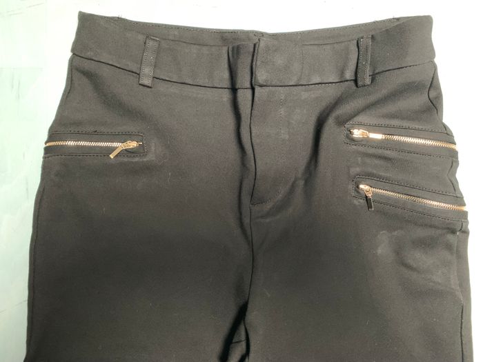 Marque "Kiabi", 3 fausses poches zippées dorées devant, petite fente chevilles, braguette zippée + agrafe + bouton. Passants pour ceinture (non fournie). matière extensible 68% viscose, 29% polyamide, 3% élasthanne. Tour de taille 84 cm, longueur 97 cm.