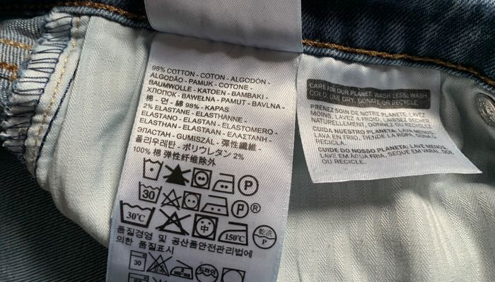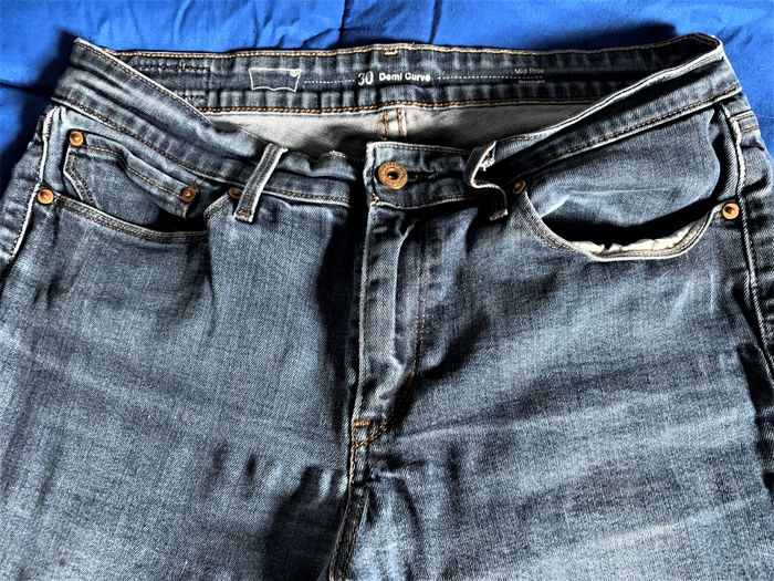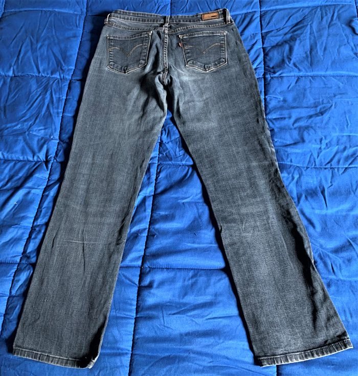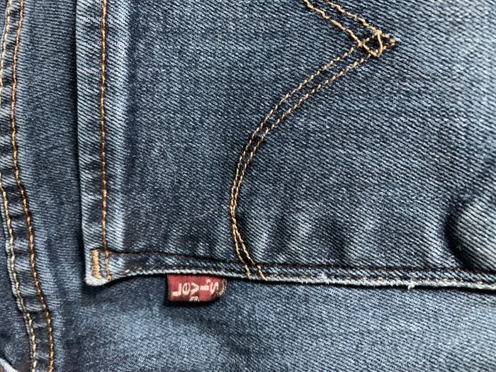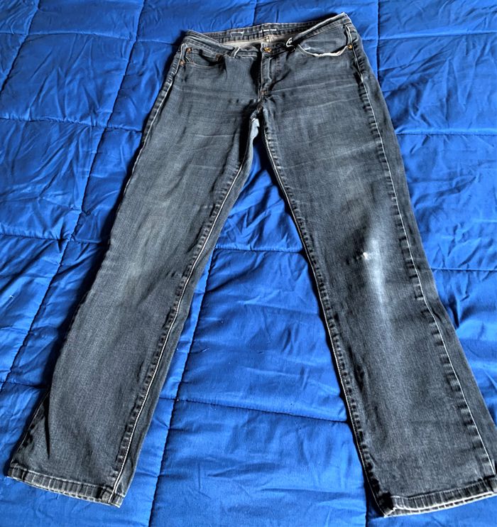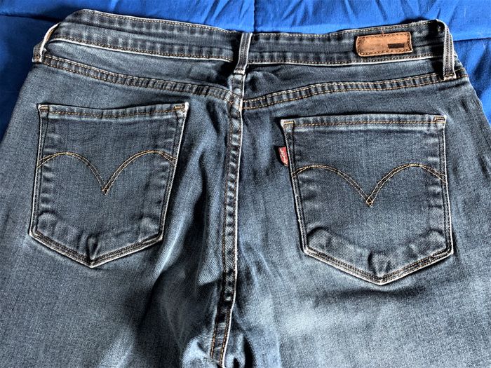 Marque "Levi's", pour femme ou homme. Matière 98% coton, 2% élasthanne. Braguette zip + bouton, passants pour ceinture (non fournie). 2 poches devant, 2 poches arrière. Délavé avec usure sur 1 des genoux (photo 8) Tour de taille 86 cm, longueur 96 cm.