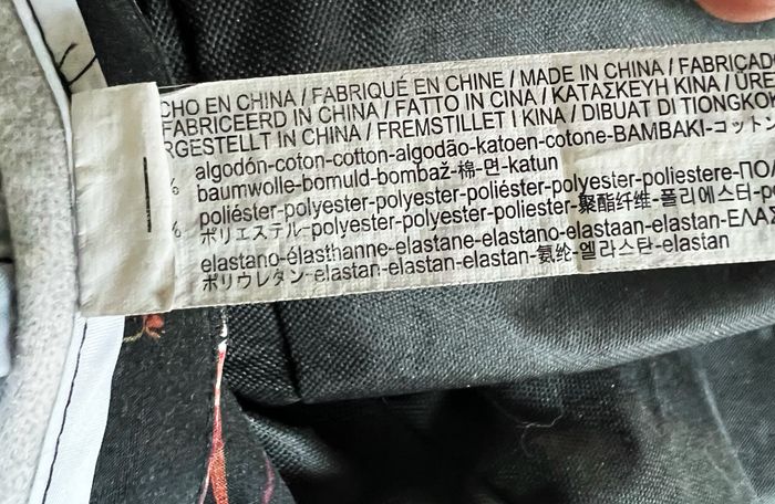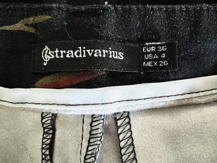 Marque "Stradivarius", style japonisant. Matière 76% coton, 22% polyester, 2% élasthanne, légèrement satinée, entièrement doublé. Braguette zip+ crochet + bouton. 2 poches côtés, 2 fausses poches au dos. Passants pour ceinture (non fournie). Tour de taille 80 cm, longueur 89 cm.