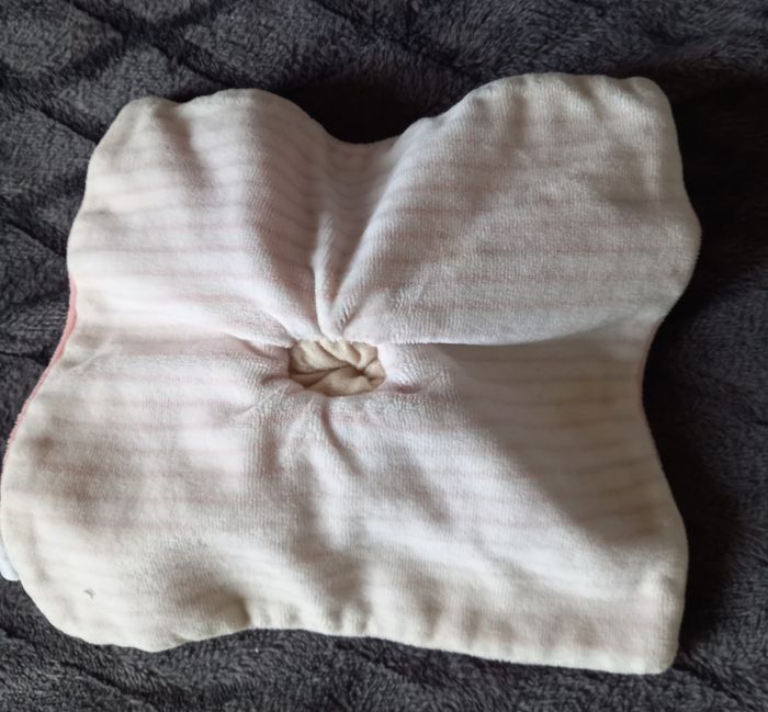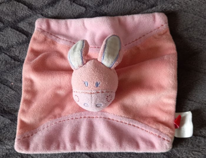 Doudou carré plat en velours de couleur rose et saumon et de l autre côté en velours de couleur blanc rayés Cheval sur le milieu du doudou