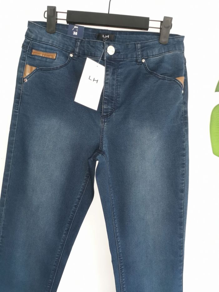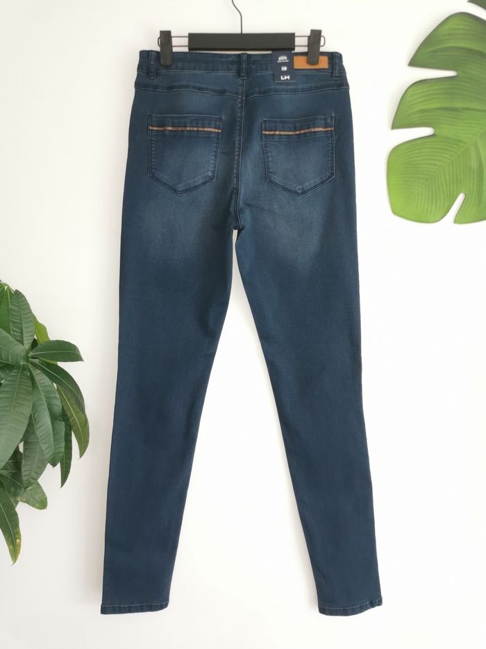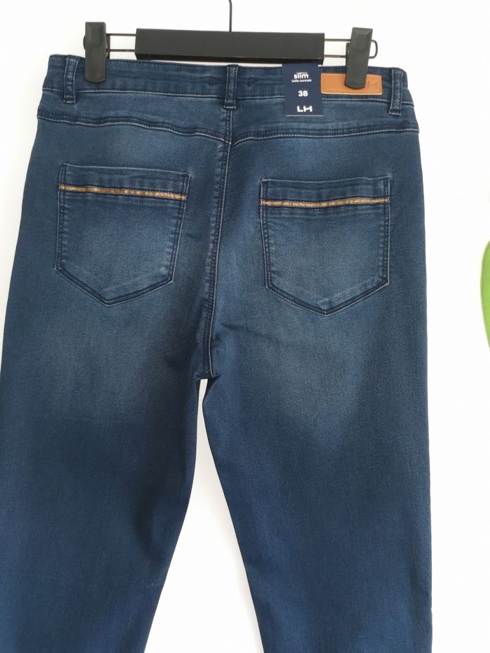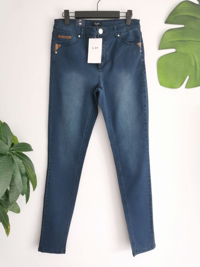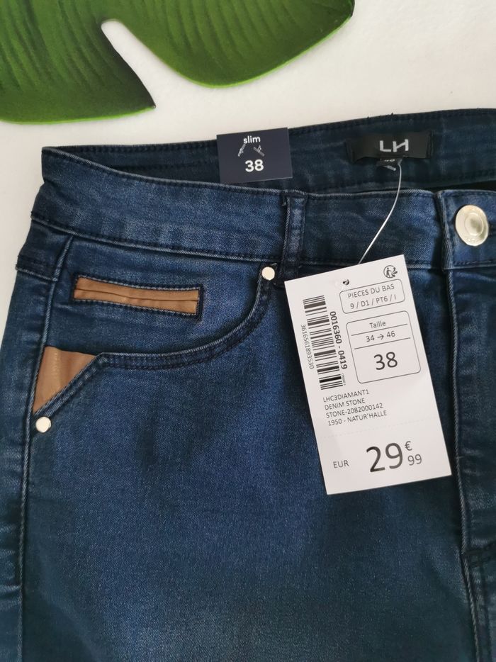 👖 ÉTAT DE L'ARTICLE: 10/10 ✅️ Avec étiquette🔖, jamais porté Jean 👖 slim 👩 La Halle Taille 38 • Matière: 69% coton - 29% polyester - 2% elasthanne • Coupe slim • Taille normale • Fermeture zippée ➕bouton 🔘 • Passants pour ceinture • 2 Poches avant - 2 poches arrière • Détails en simili cuir marron 🟤 au niveau des poches • Couleur: Stone - Bleu marine 🟦 • 📏 Taille à plat: 36 cm • 📏 Longueur: 104 cm 💰Prix boutique: 29.99€ Parfait état 👌, avec étiquette 🏷, jamais porté 🔵🔵