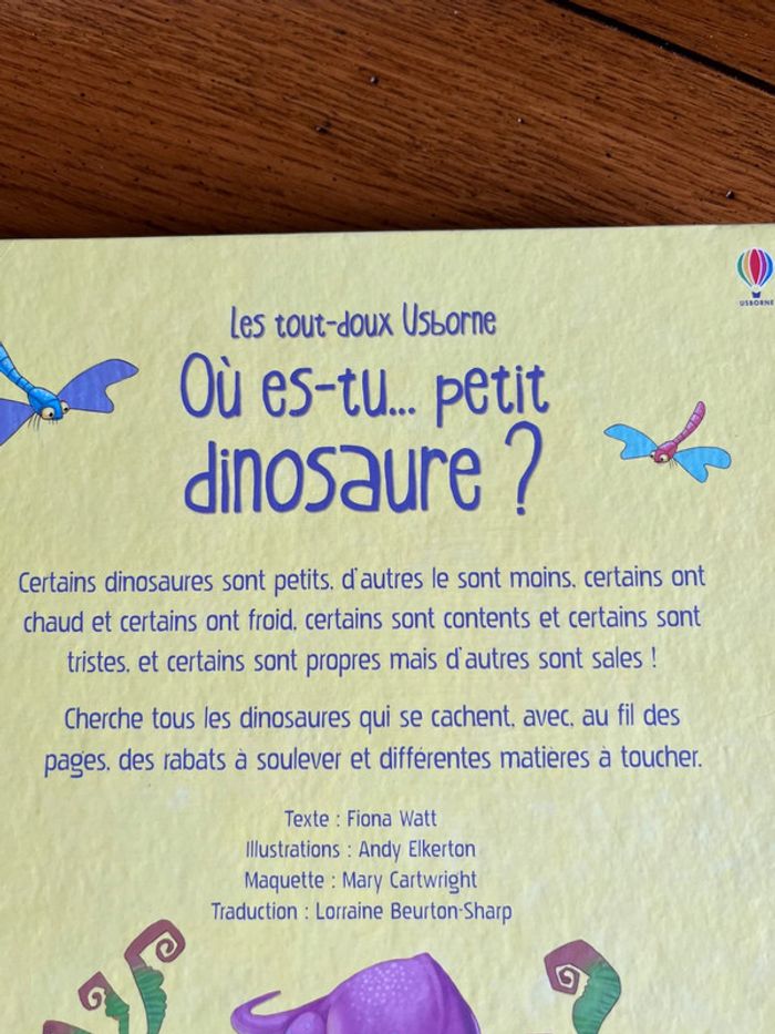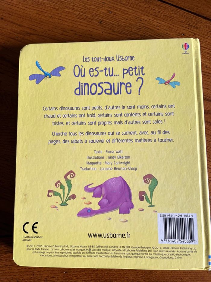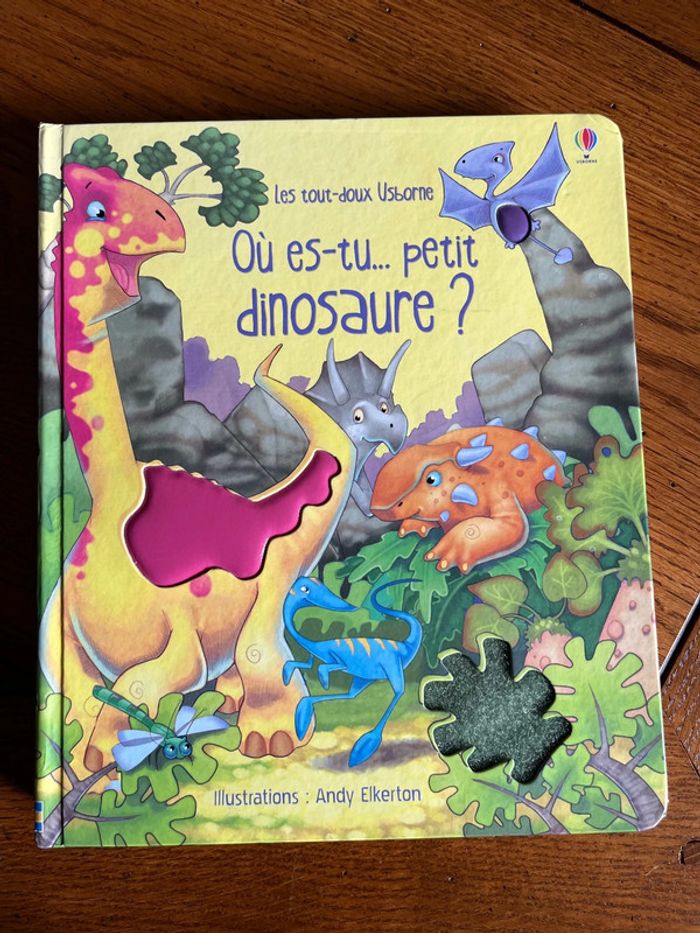 Où es tu petit dinosaure ? Très beau livre pour les petits Des dinosaures à trouver , des rabats à soulever et différentes matières a toucher Livre cartonné en très bon état sauf 3?rabats maintenus avec du scotch #juvignymarysemaisonlivres