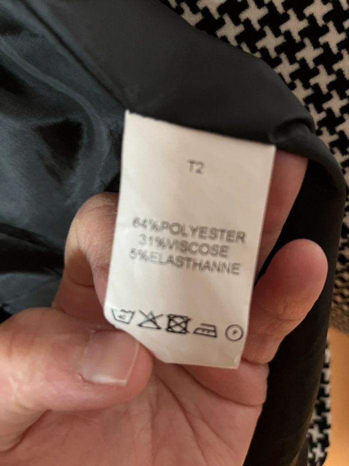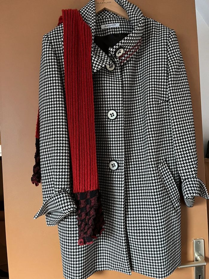 Très joli pied de poule En excellent état ( très peu porté) Liseré rouge au col Écharpe rouge offerte Taille 2 correspond à un 42 , voir le tableau des tailles trouvé sur leur site ( dernière photo ) #juvignymarysefemmes42
