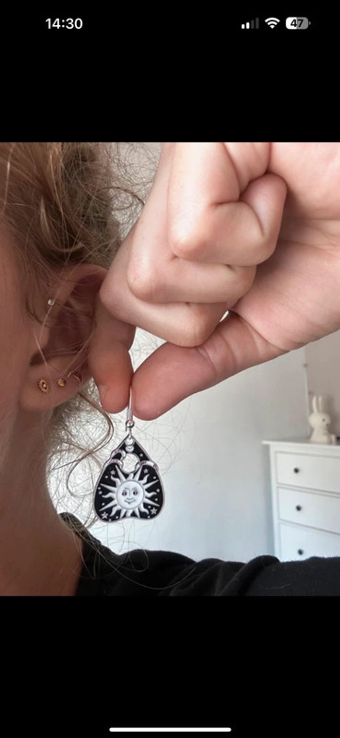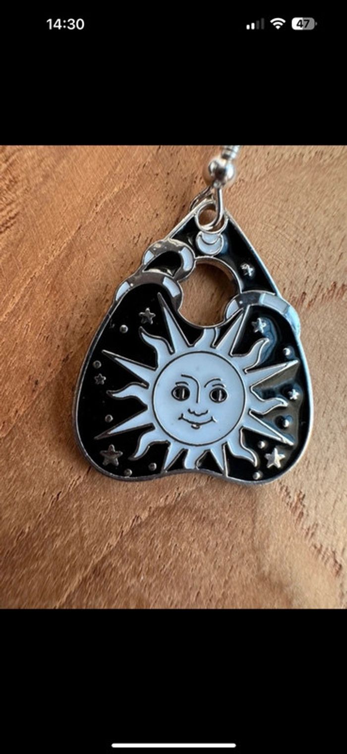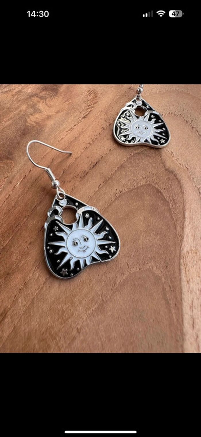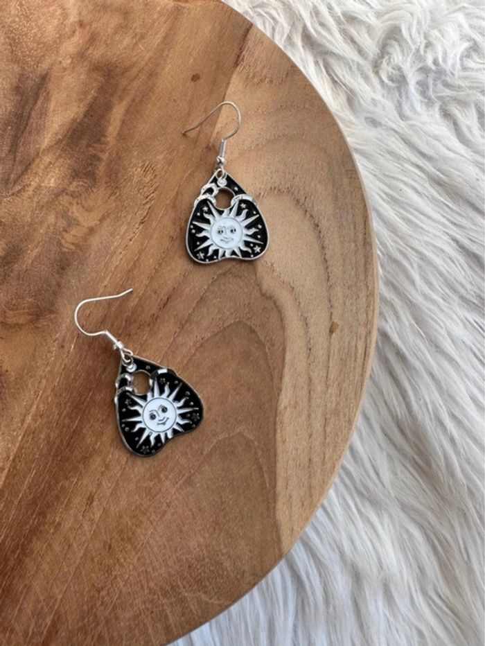 Paire de boucles d’oreilles pendantes Avec tablettes de ouija Représentant le soleil 🌞 Sur fond noir, motifs blancs et argentés En excellent état Parfaites en cette saison de Halloween ou au quotidien ☺️