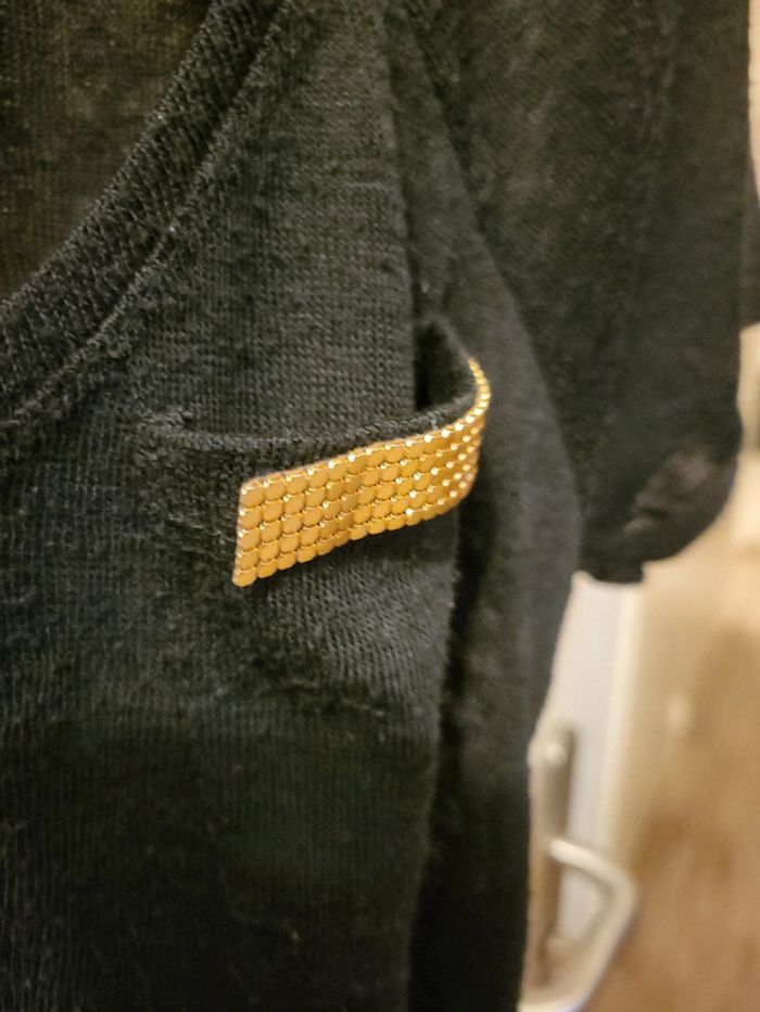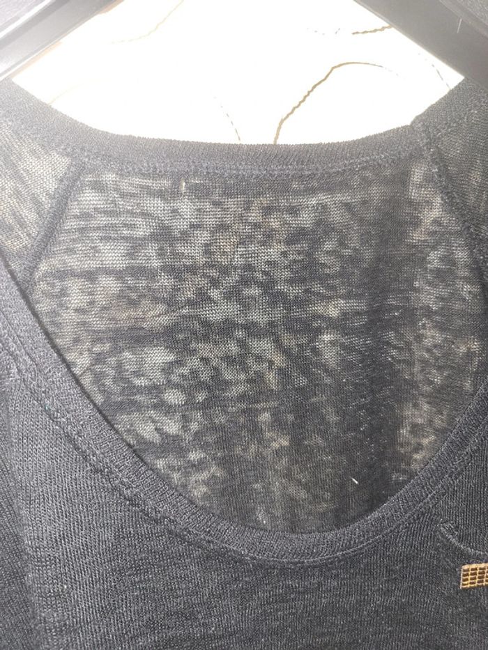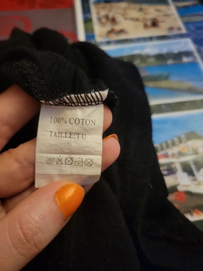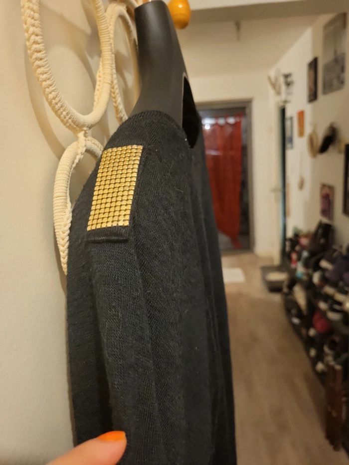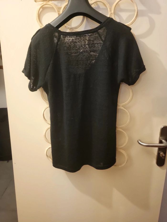 Beau t shirt noir avec légère transparence. Strass or. Il y a un petit trou à l'arrière ( en enlevant l'étiquette... voir photo), il y a aussi le strass qui commence à être décollé. 100% coton. Mim. Taille unique. ( 38/40/42). #echelon1838 #echelon1840