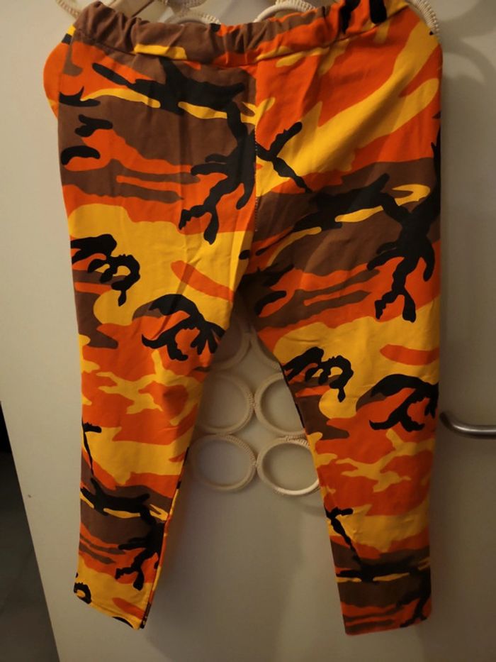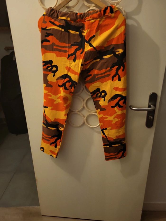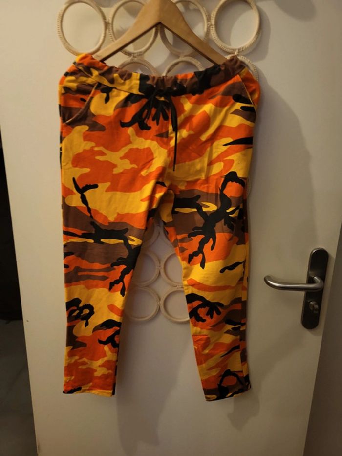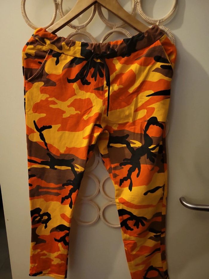 Magnifique jogging imprimé jaune orange noir et marron. En très bon état. Taille 38. Fabriqué en italie. 100% coton. Taille à plat 36cm Longueur total 84 cm #echelon1838