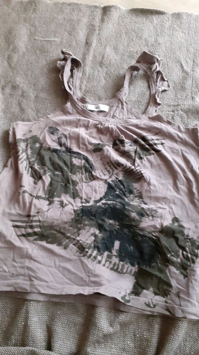 Débardeur marron clair avec bretelle en froufrou et motif d'oiseaux s'envolant . Taille 4. Taille 42-44
