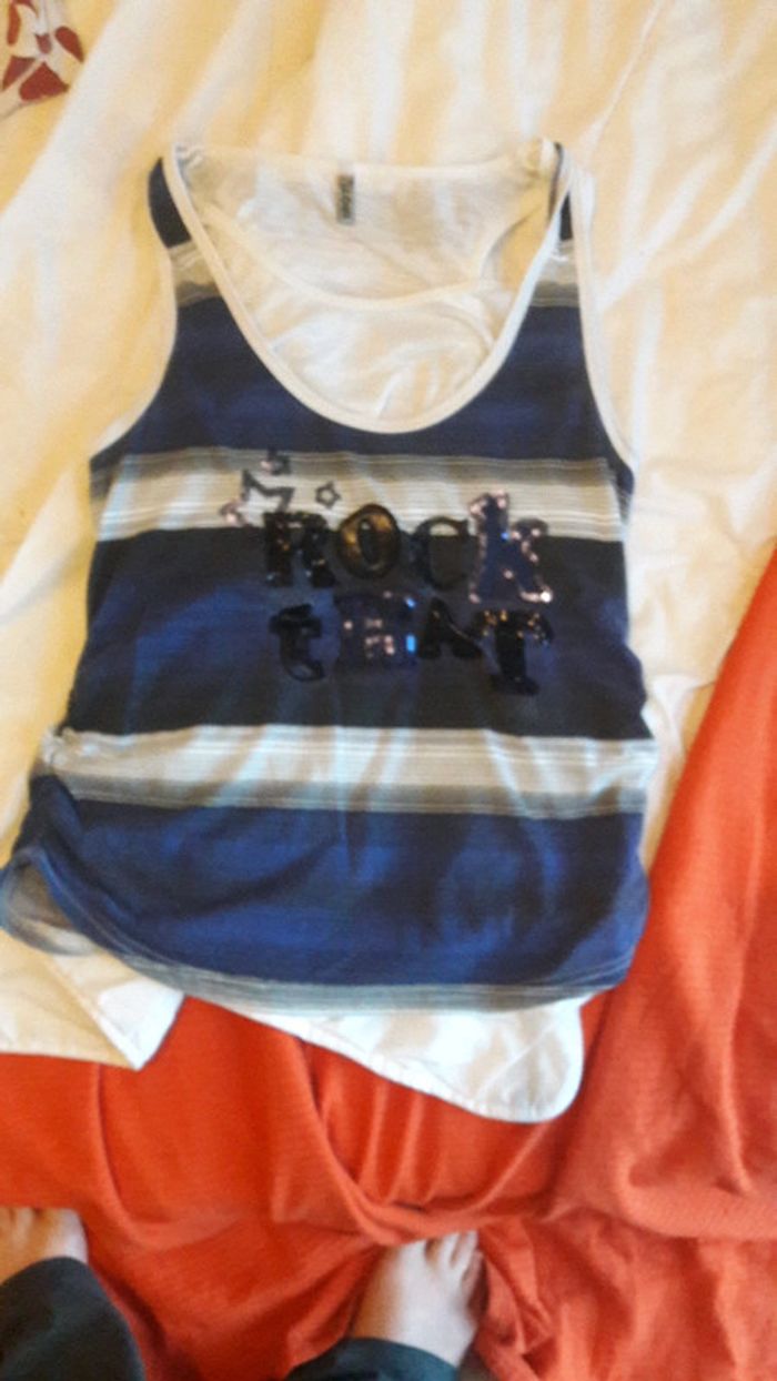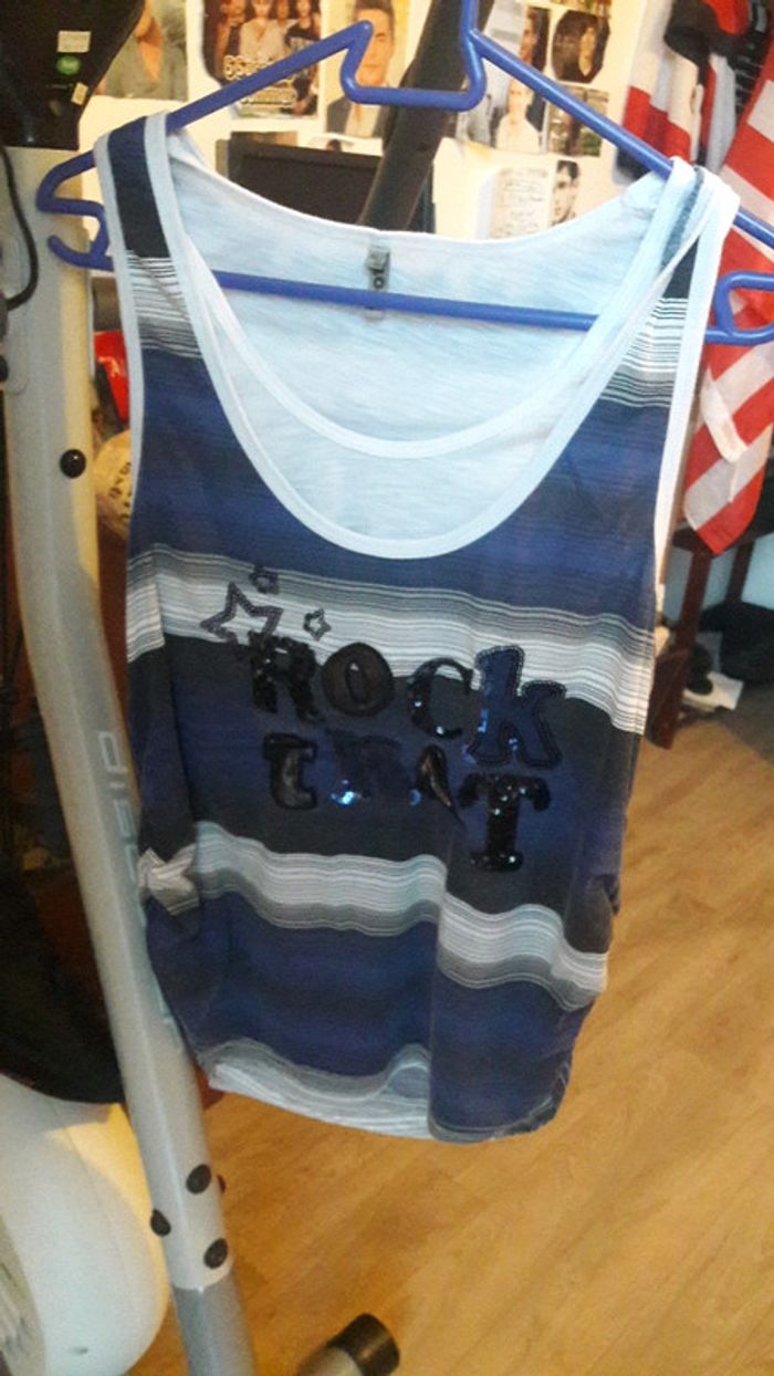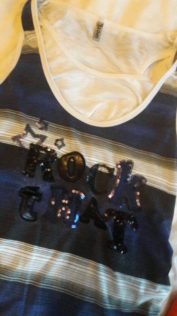 T shirt peu porté à rayure avec inscription " rock that " , très léger , fausse taille disant " 46 " mais taille pour 40-42