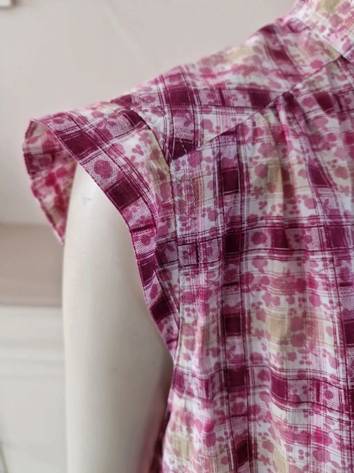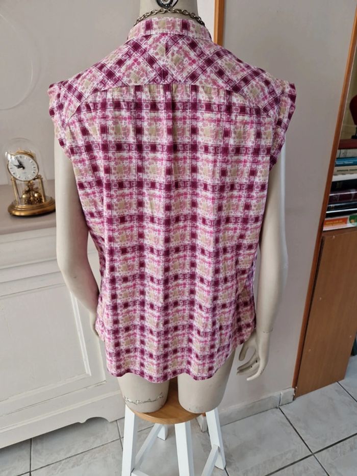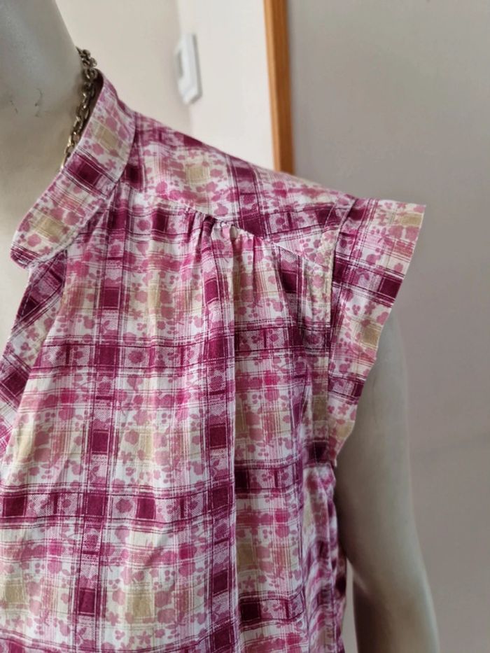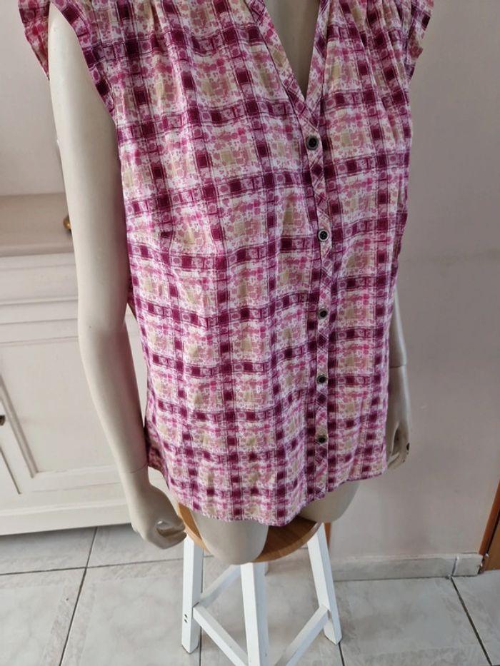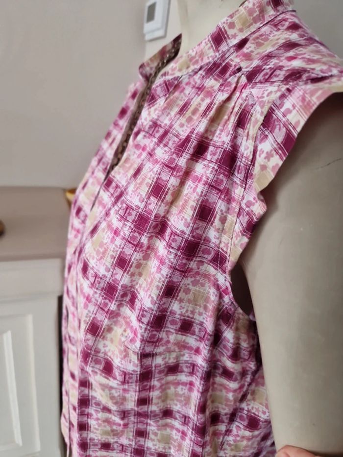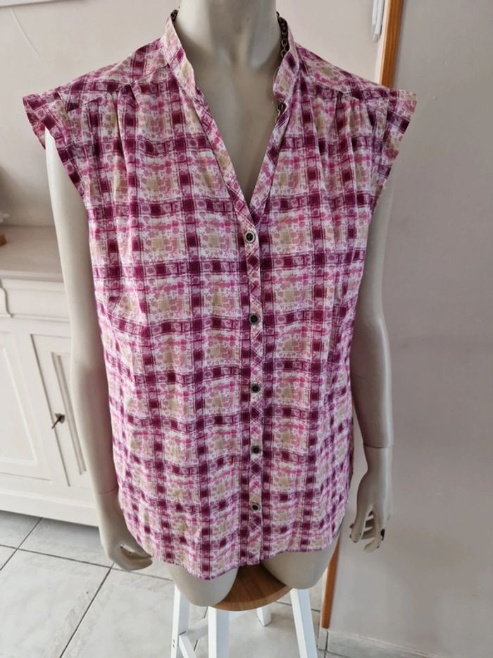 Jolie blouse sans manches. Décolleté en V fermé par des boutons métalliques. Jeux de plis au épaules. Petit volant à l'emplacement des manches. Étiquette de la marque en bas de la blouse. Coupe confortable et matière douce. #ellaben_blousesfemmes #ellaben_grandestailles