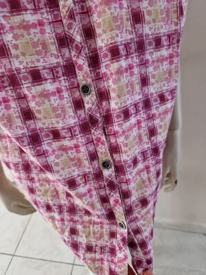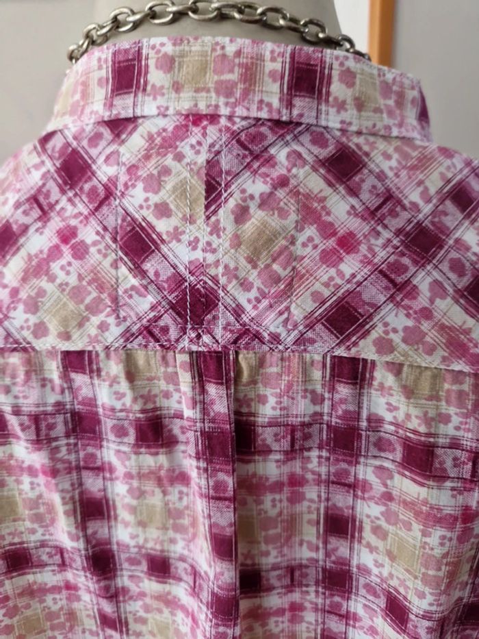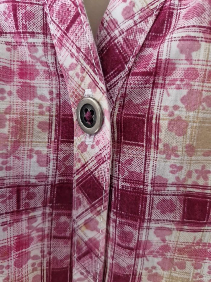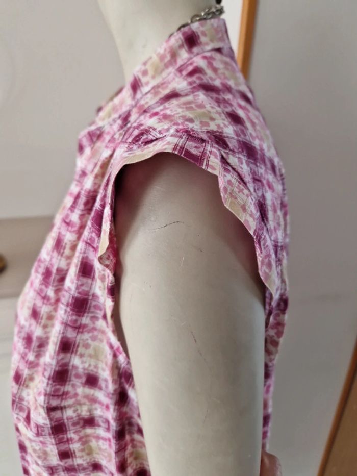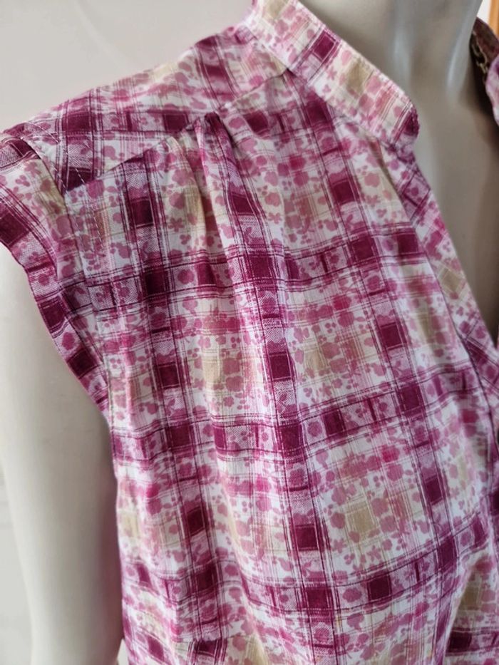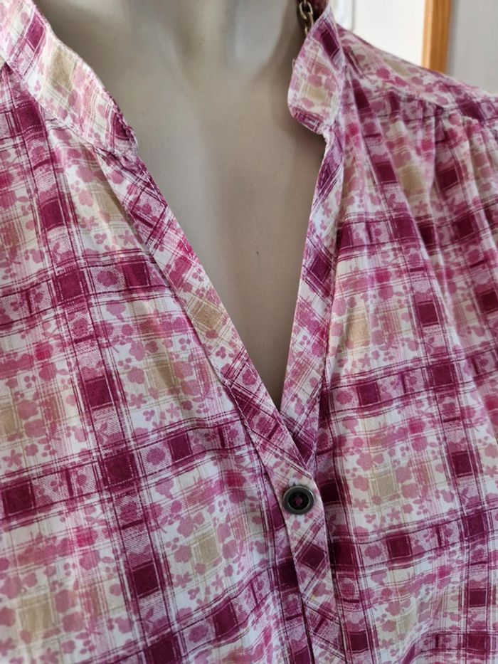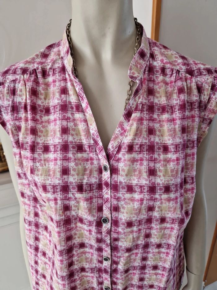 Jolie blouse sans manches. Décolleté en V fermé par des boutons métalliques. Jeux de plis au épaules. Petit volant à l'emplacement des manches. Étiquette de la marque en bas de la blouse. Coupe confortable et matière douce. #ellaben_blousesfemmes #ellaben_grandestailles