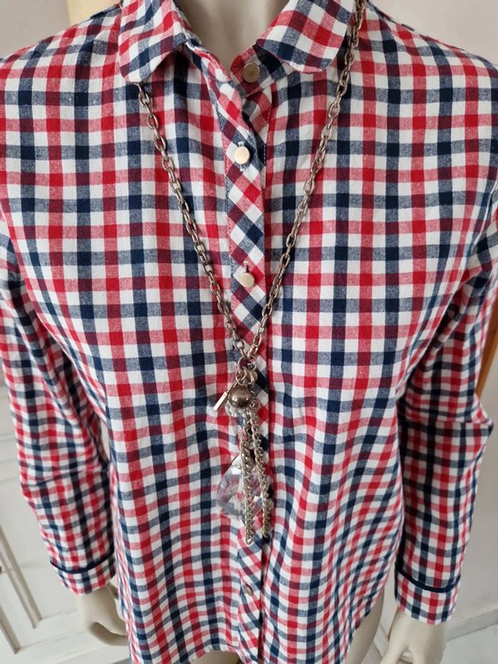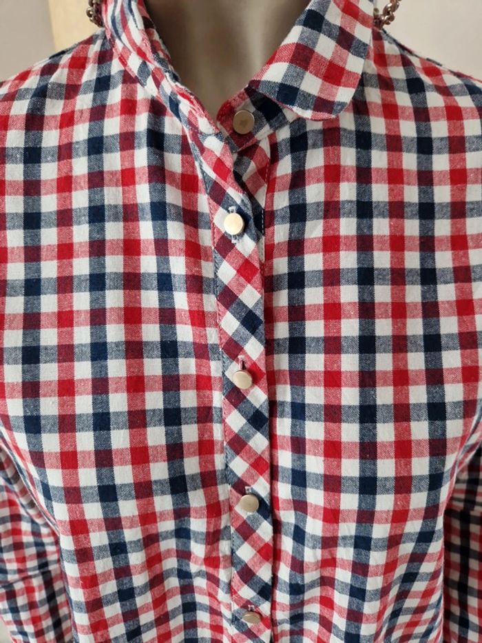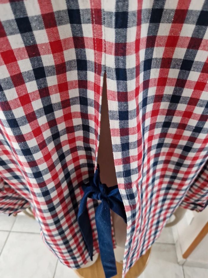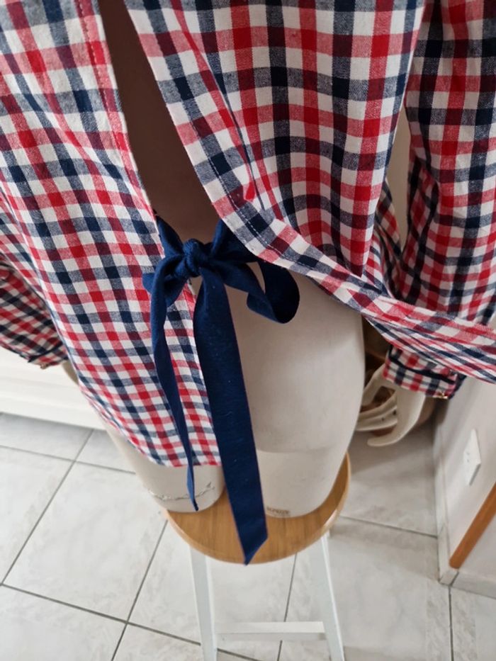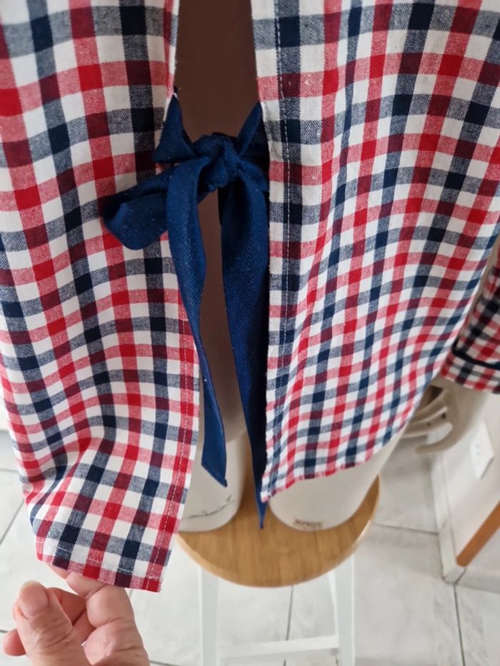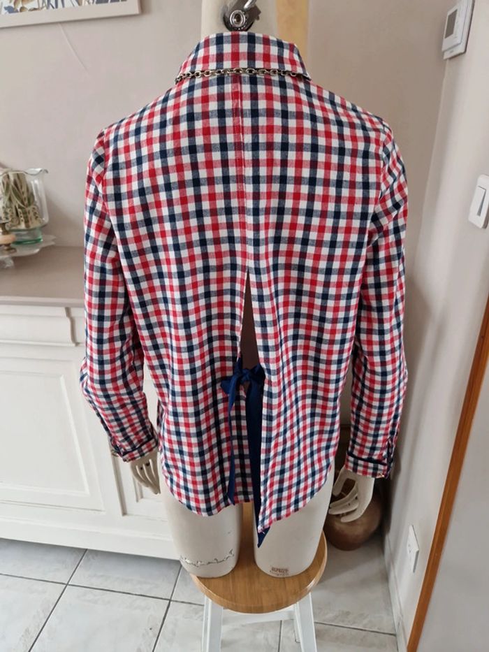 Jolie chemise à carreaux manches longues avec une ouverture dans le dos qui se ferme par un noeud bleu marine. Boutons métalliques devant dt à l'extrémité des manches. Original et 100% coton cette chemise. #ellaben_chemisefemme