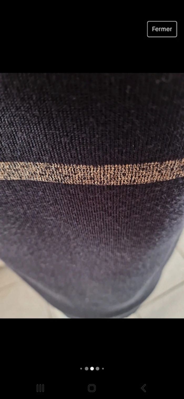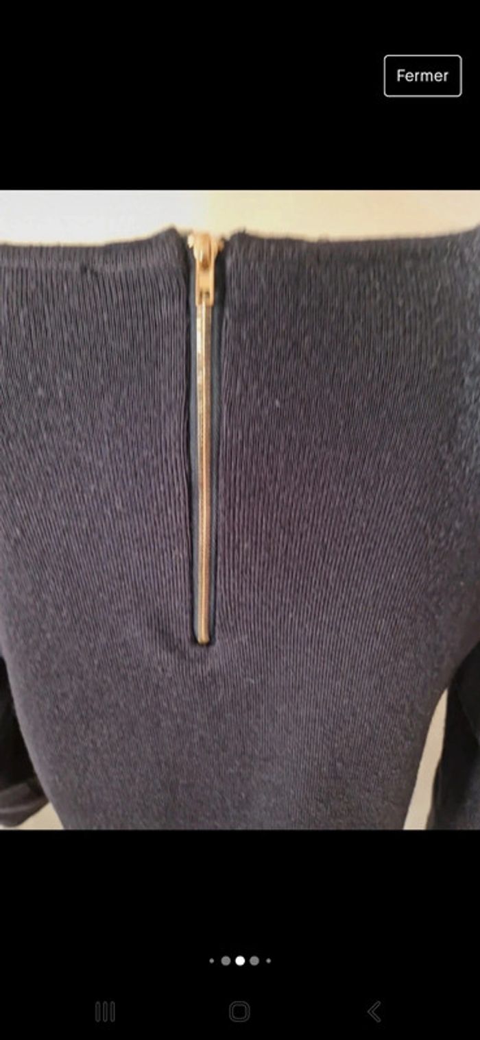 Jolie robe manches trois quarts avec un liseré de couleur or à la taille. Fermeture éclair visible dans le dos Col rond. Robe droite classique en laine. #ellaben_robes #ellaben_robesnoires