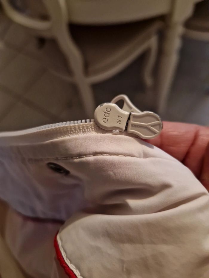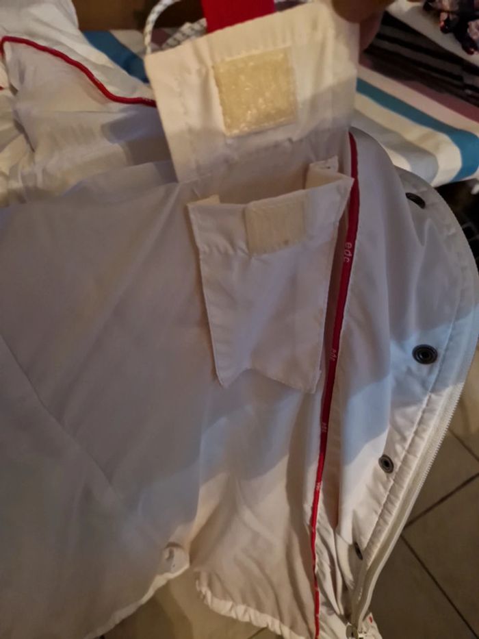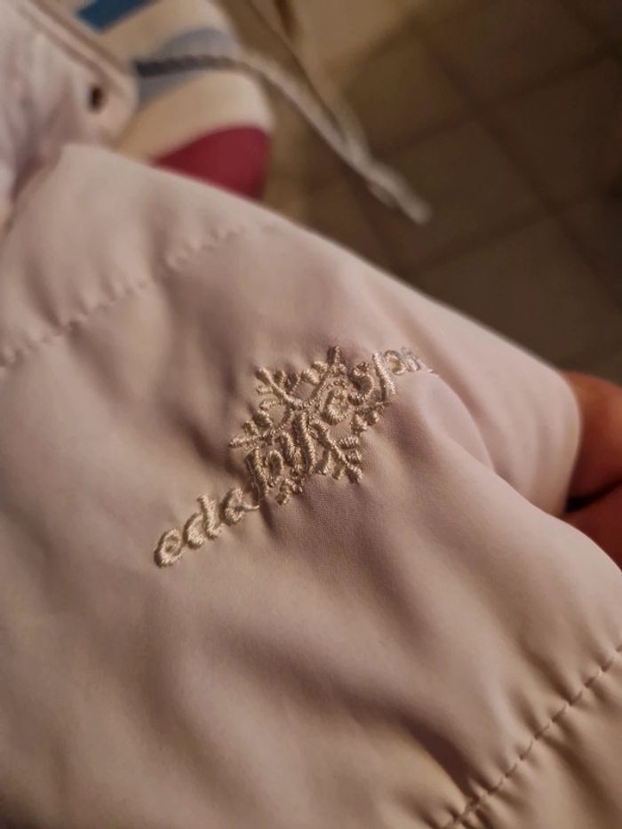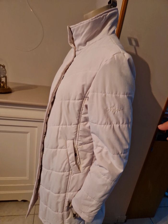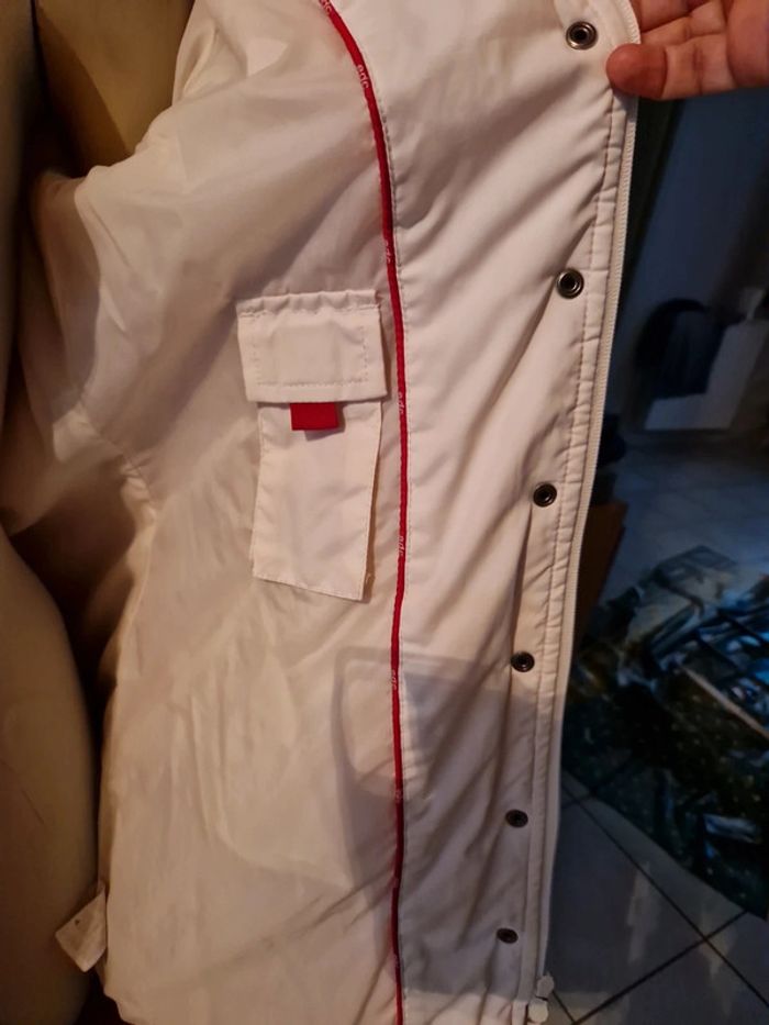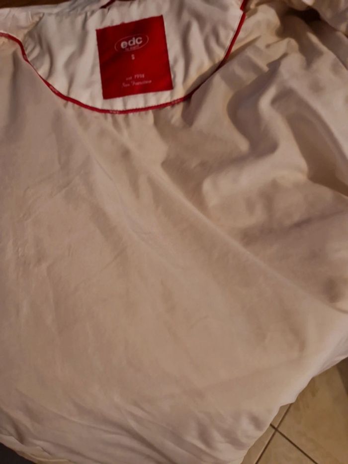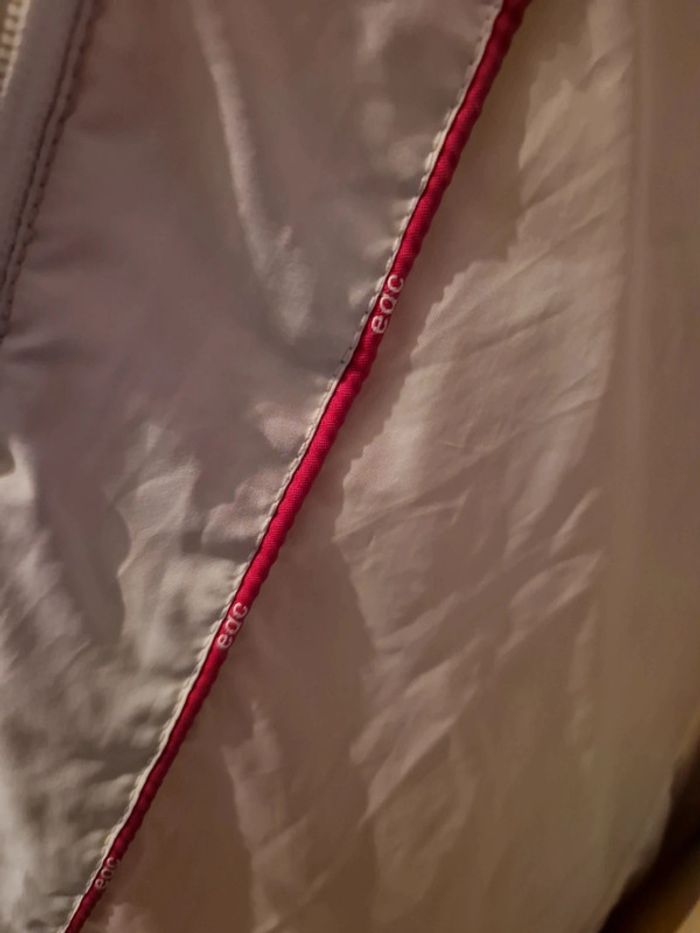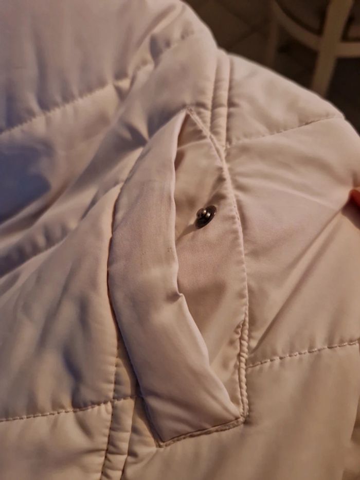 Jolie doudoune matelassée de couleur blanc cassé. Manteau long de la marque Edc by Esprit. Fermeture éclair et boutons pressions Deux poches latérales avec également un bouton pression. Petite poche intérieure avec un scratch. Biais rouge à l'intérieur de la doudoune. #ellaben_manteau #ellaben_skis
