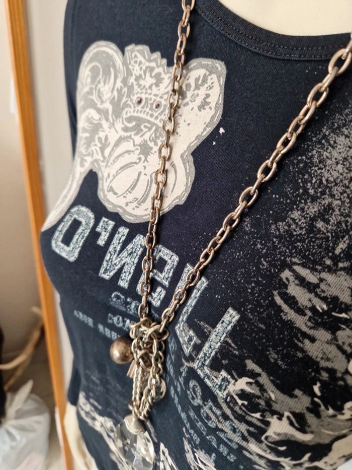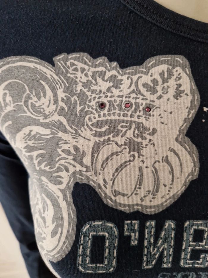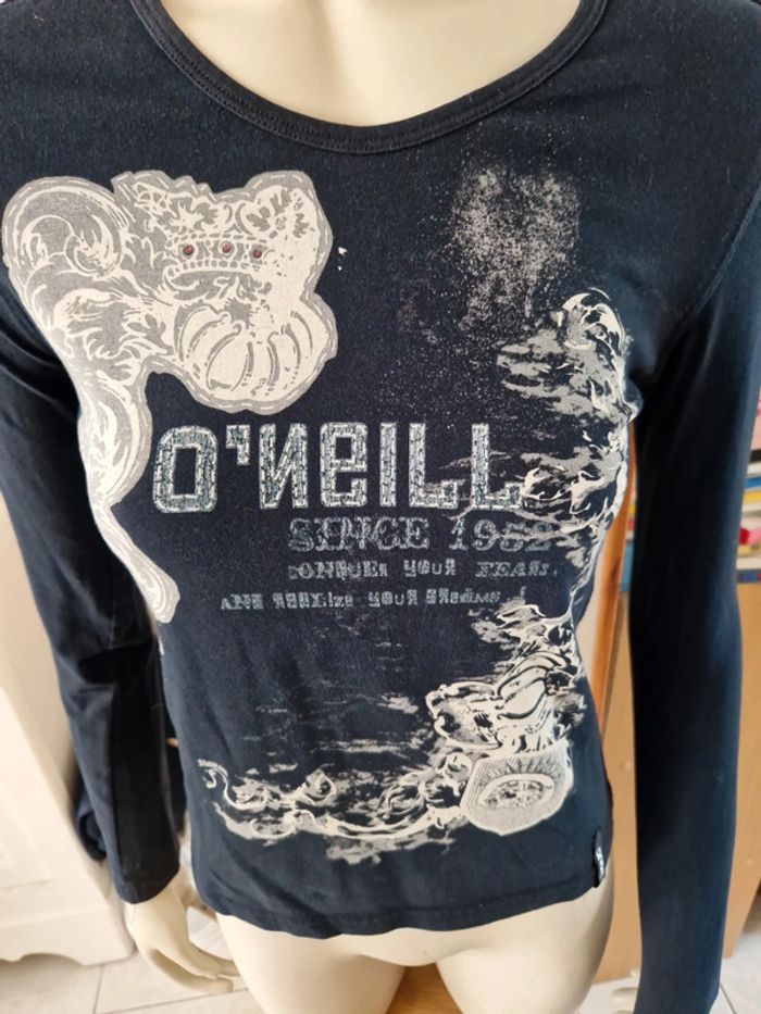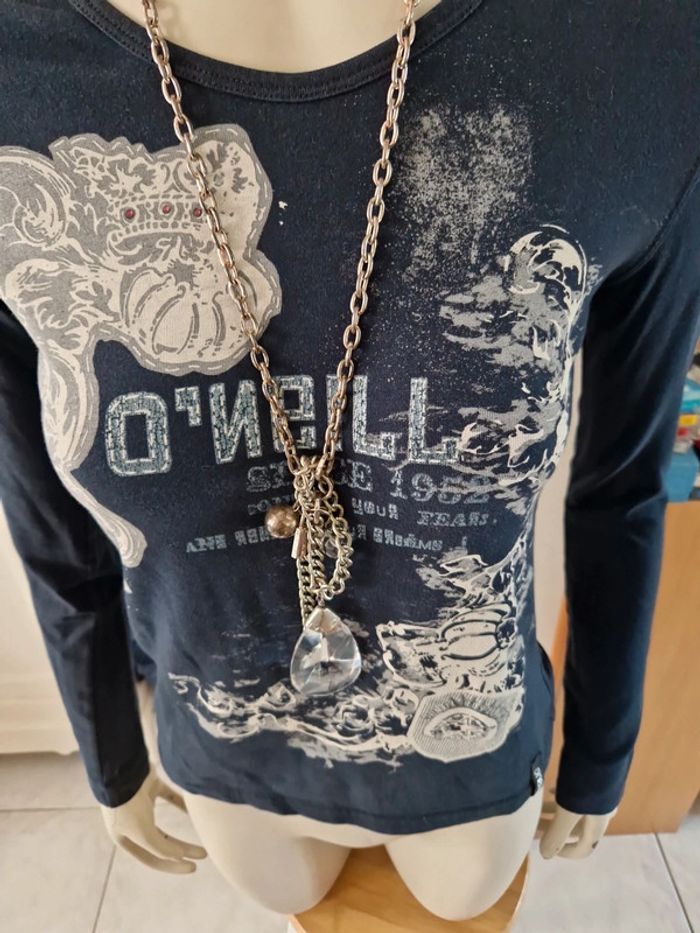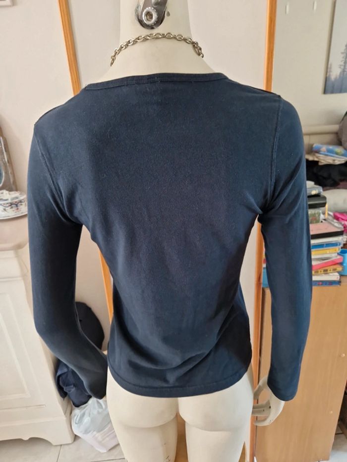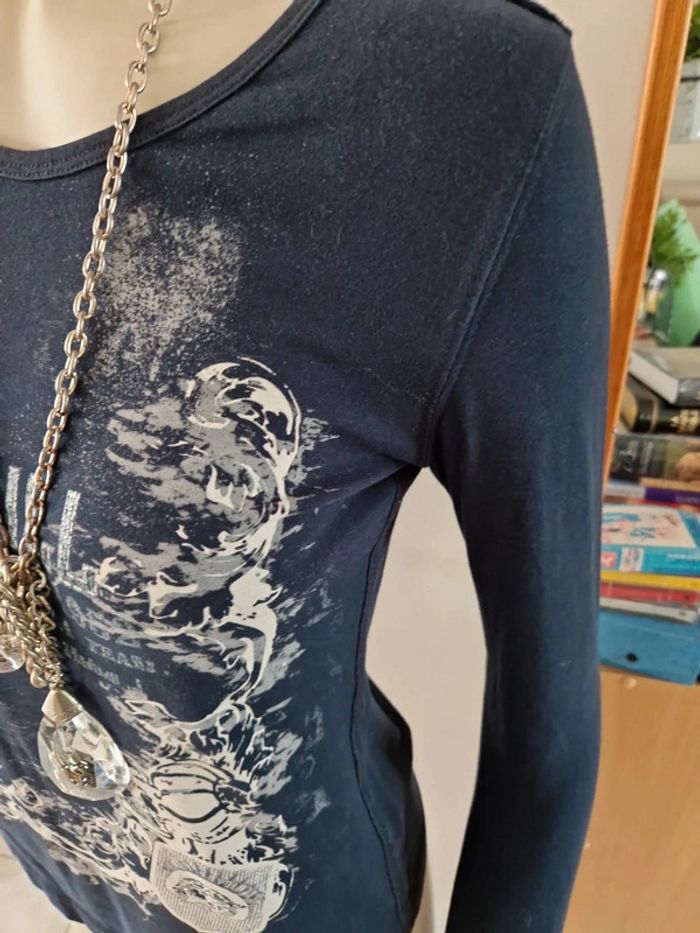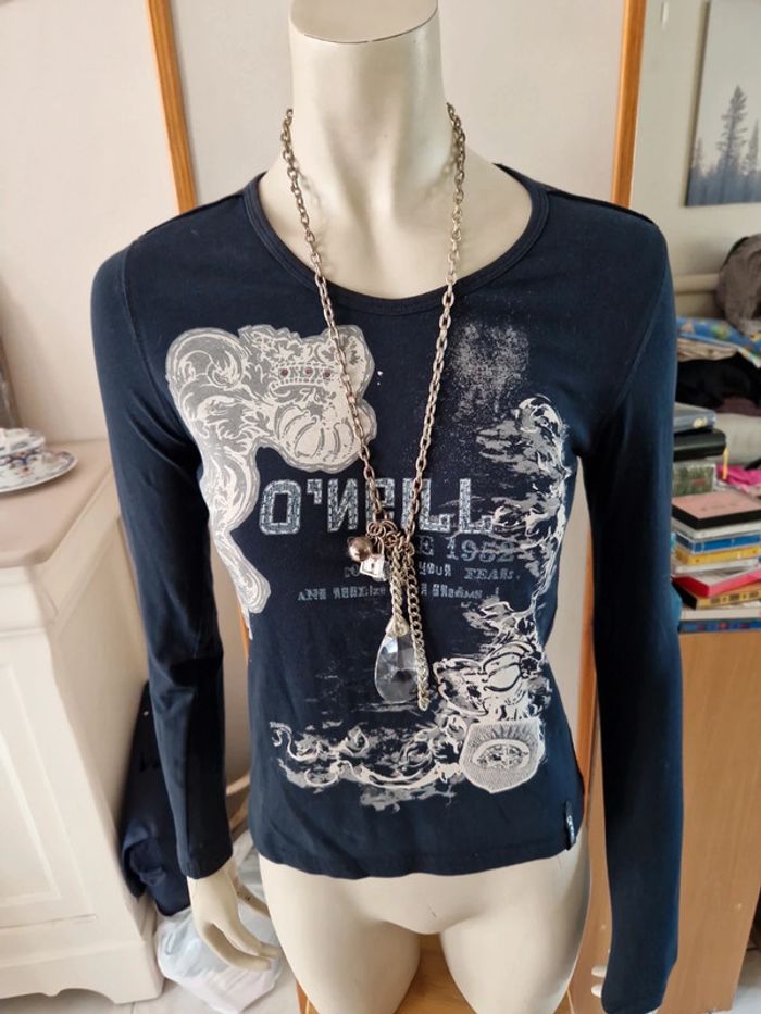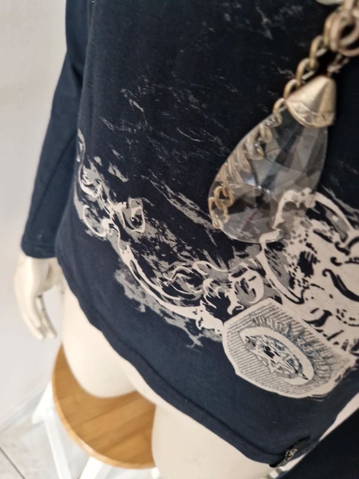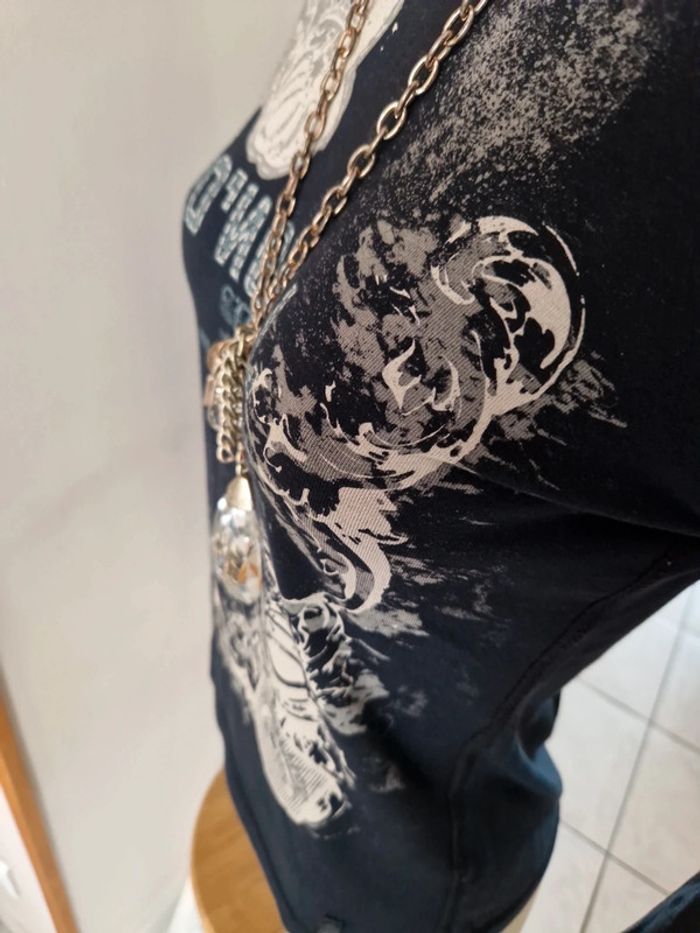 T-chirt fantaisie manches longues avec sur la poitrine des dessins dont l'un est incrustés de strass.Etiquette sur le côté avec le nom de la marque. Encolure ronde . #ellaben_tchirtfemme