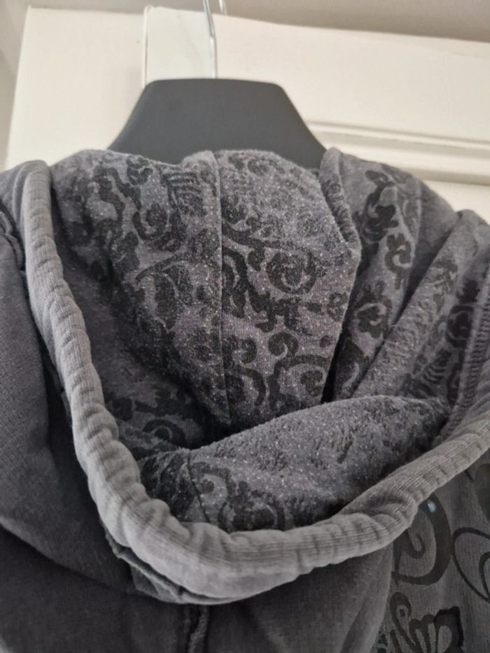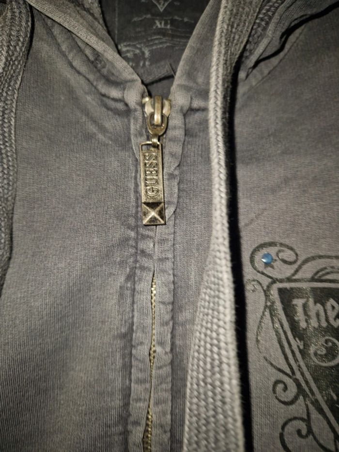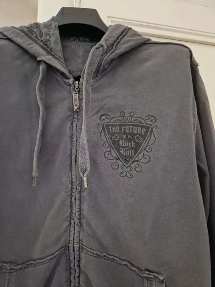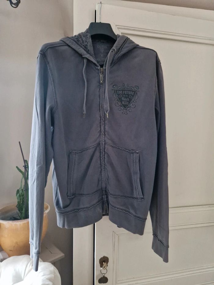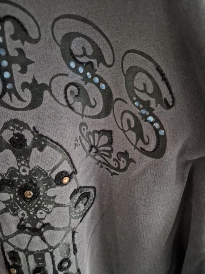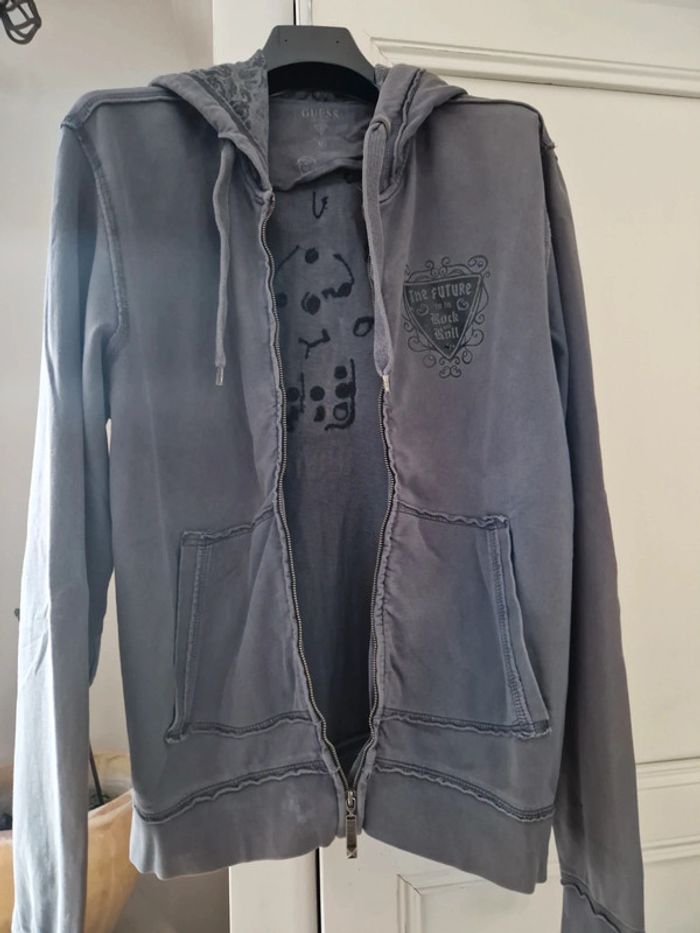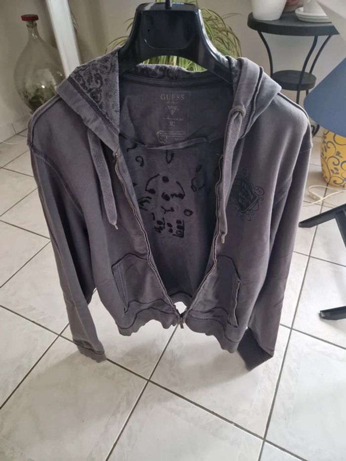 Sweat-shirt à capuche avec fermeture éclair marqué Guess. Deux poches devant. Capuche avec motifs a l'interieur et deux cordons. Superbe motif dans le dos avec des perles en métal et verre. Original ce Sweat-shirt gris 100% coton.