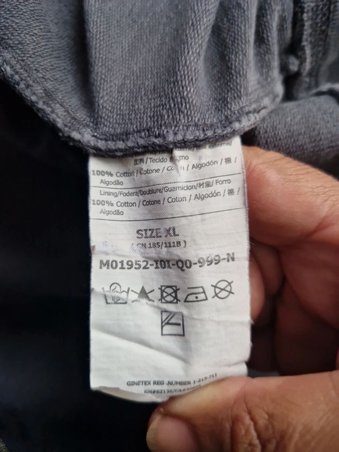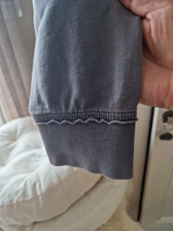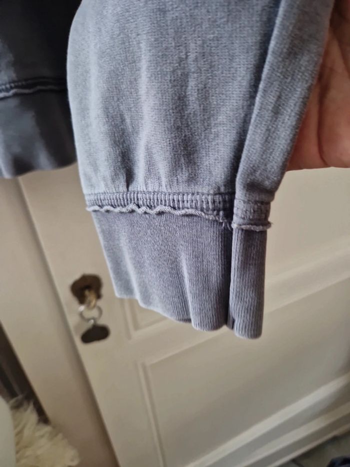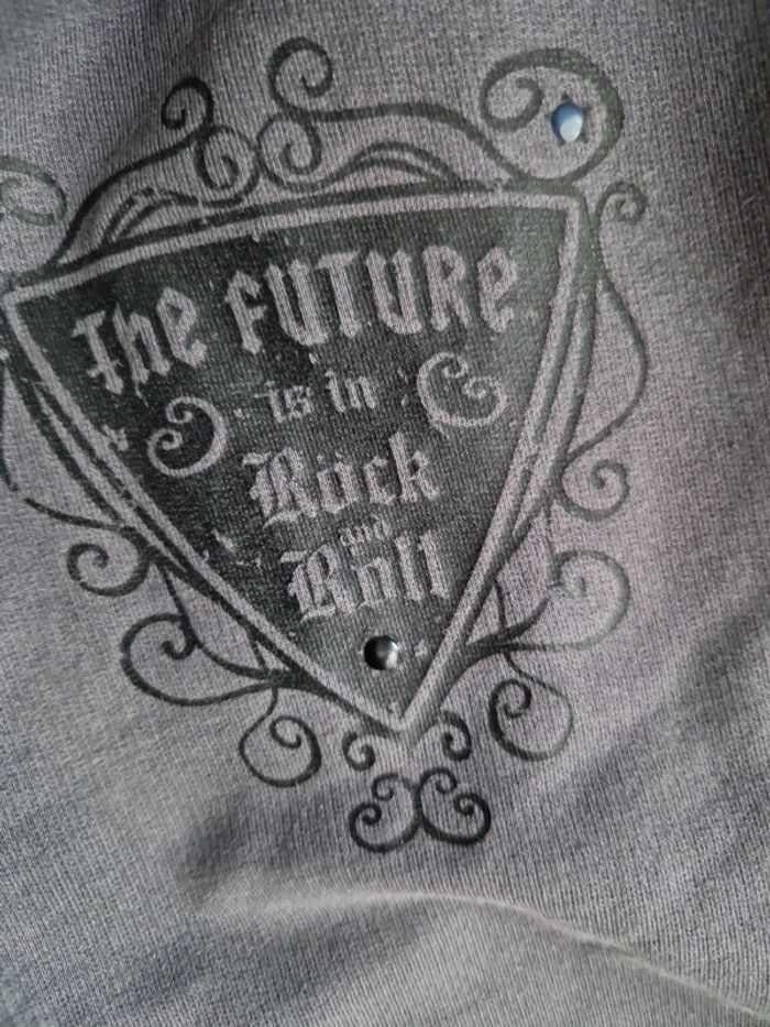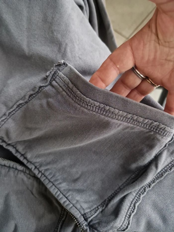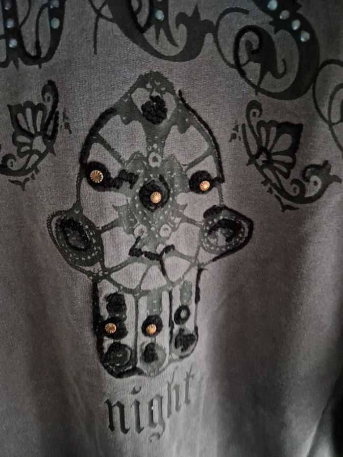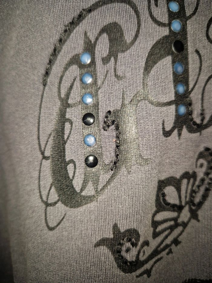Sweat-shirt à capuche avec fermeture éclair marqué Guess. Deux poches devant. Capuche avec motifs a l'interieur et deux cordons. Superbe motif dans le dos avec des perles en métal et verre. Original ce Sweat-shirt gris 100% coton.