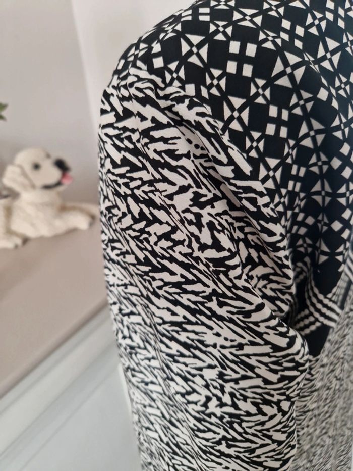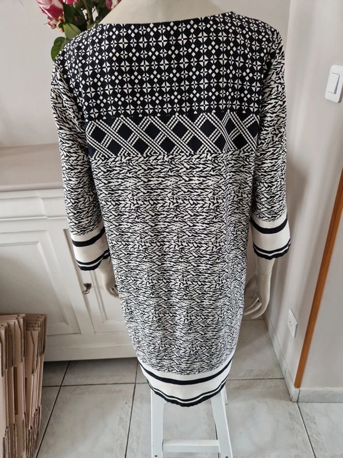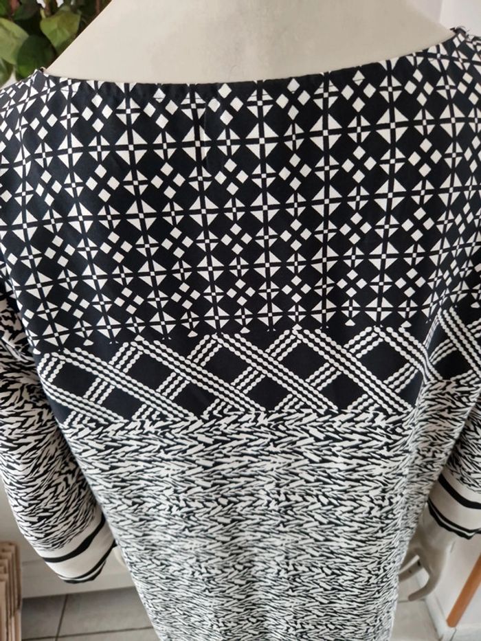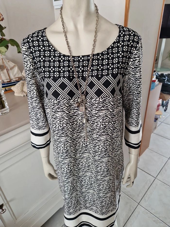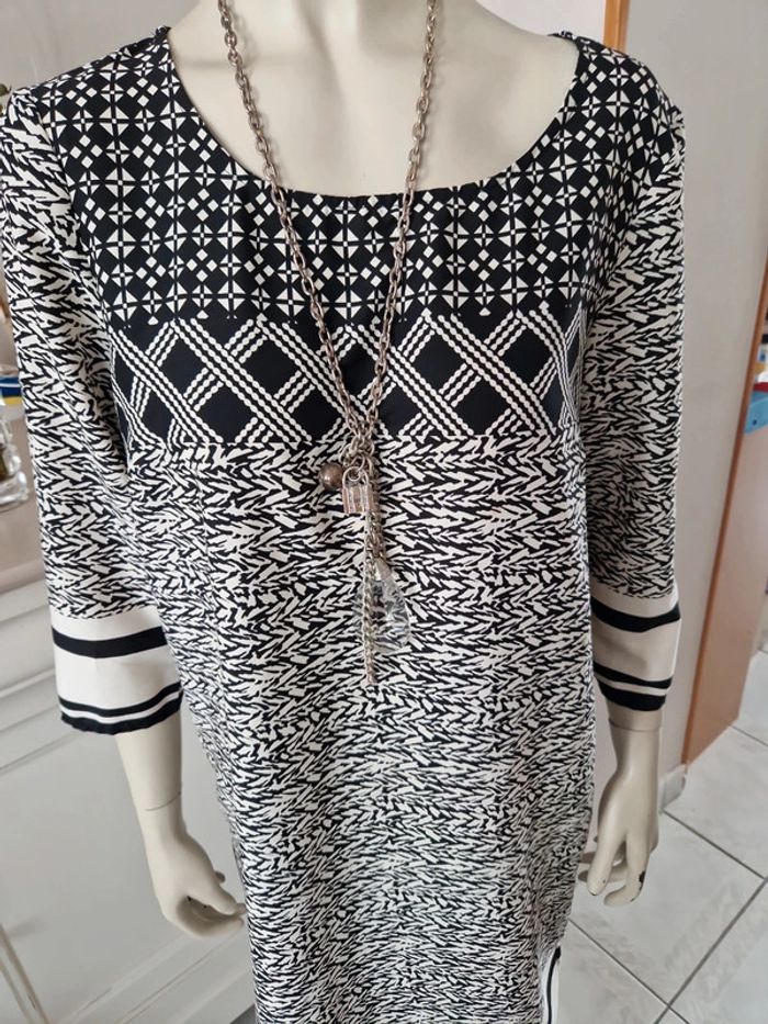 Robe droite Véronique Moda avec plusieurs motifs géométriques en noir et blanc. Manches trois quarts. Encolure ronde. Très fluide et agréable à porter. Robe très légère. #ellaben_robes