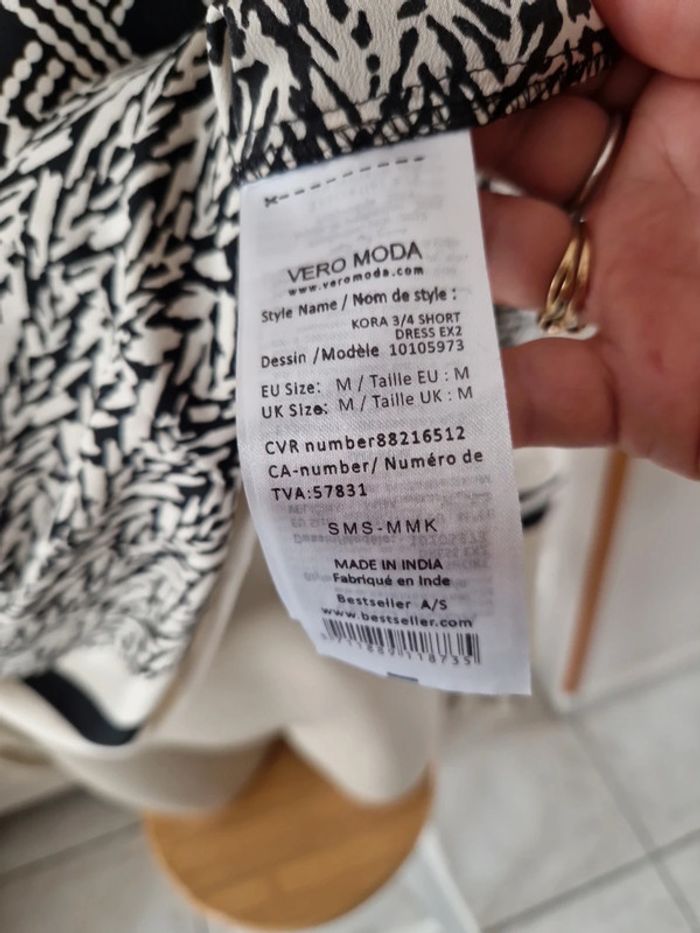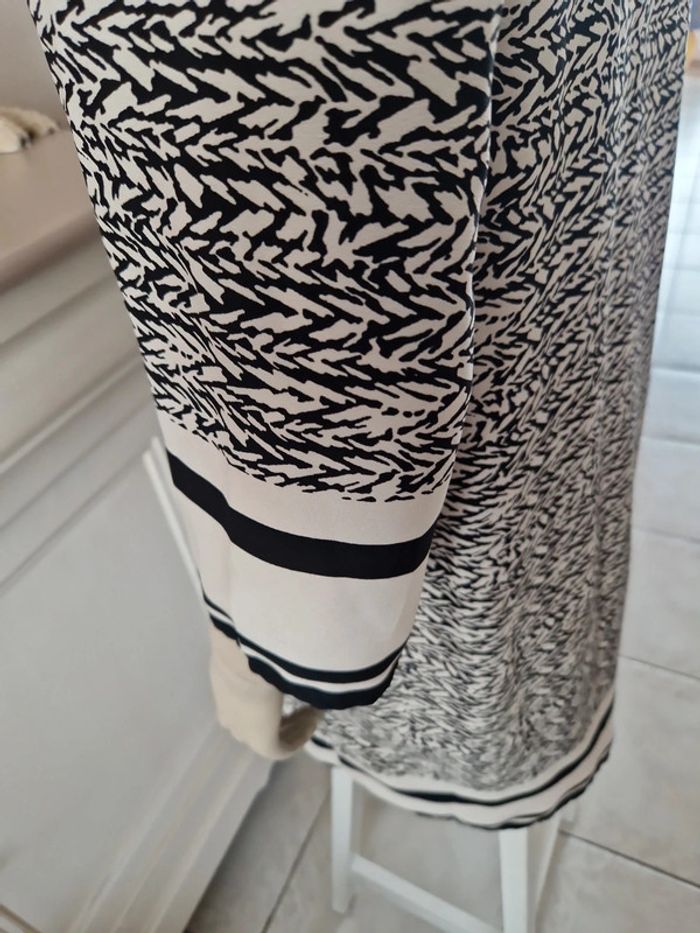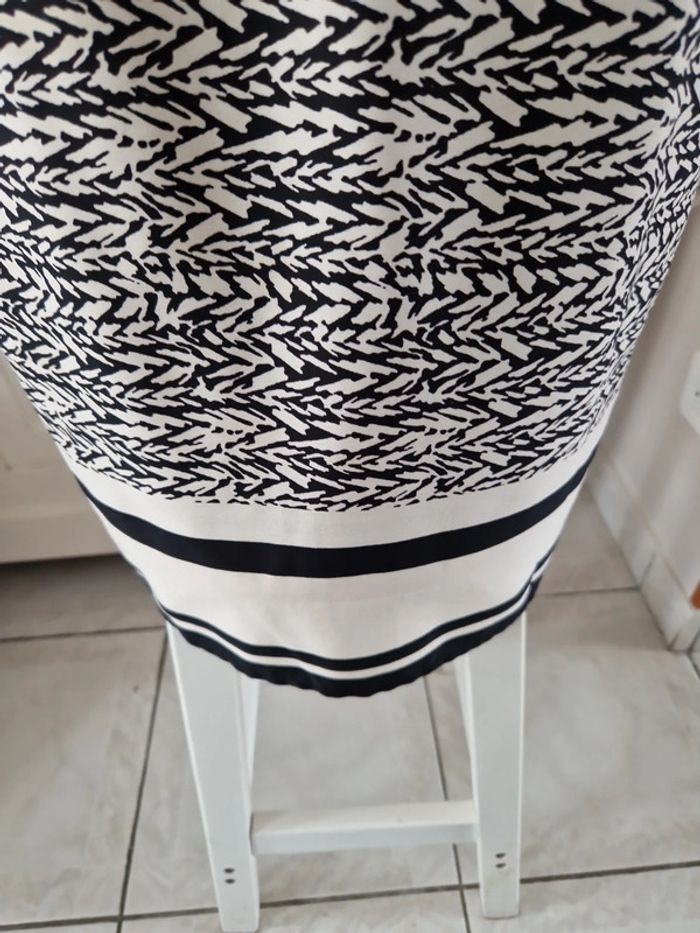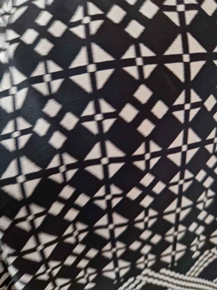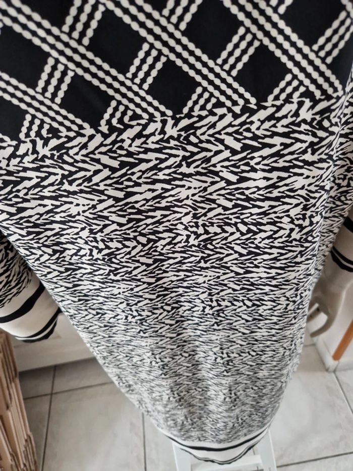 Robe droite Véronique Moda avec plusieurs motifs géométriques en noir et blanc. Manches trois quarts. Encolure ronde. Très fluide et agréable à porter. Robe très légère. #ellaben_robes