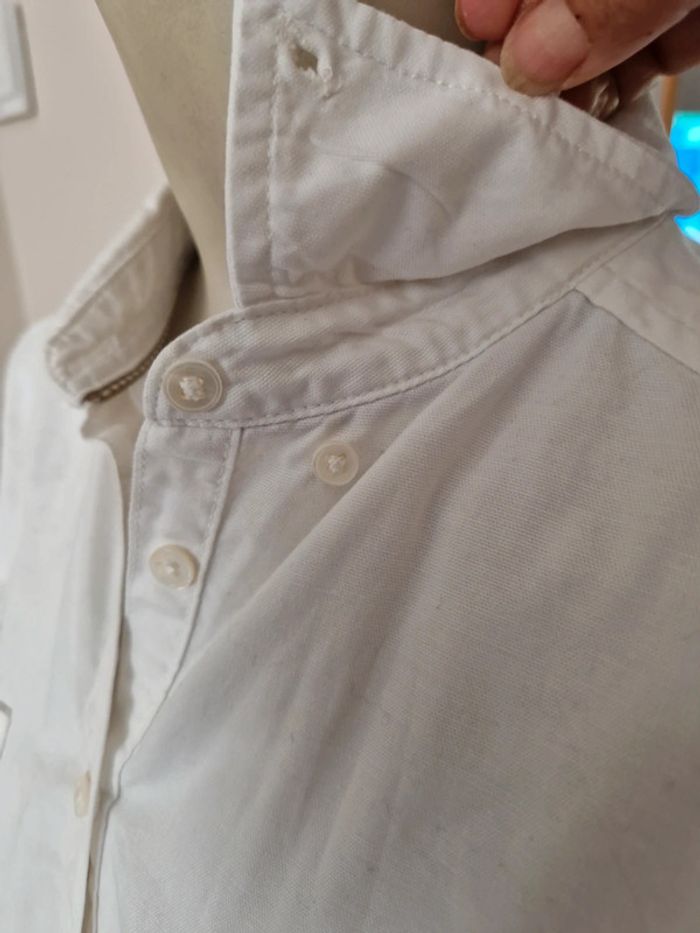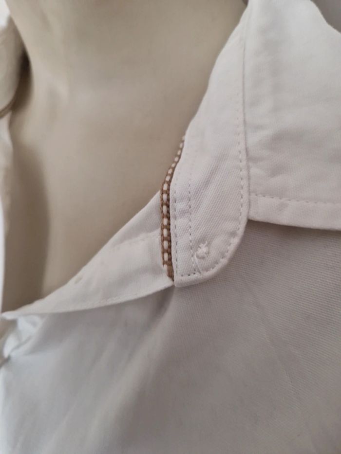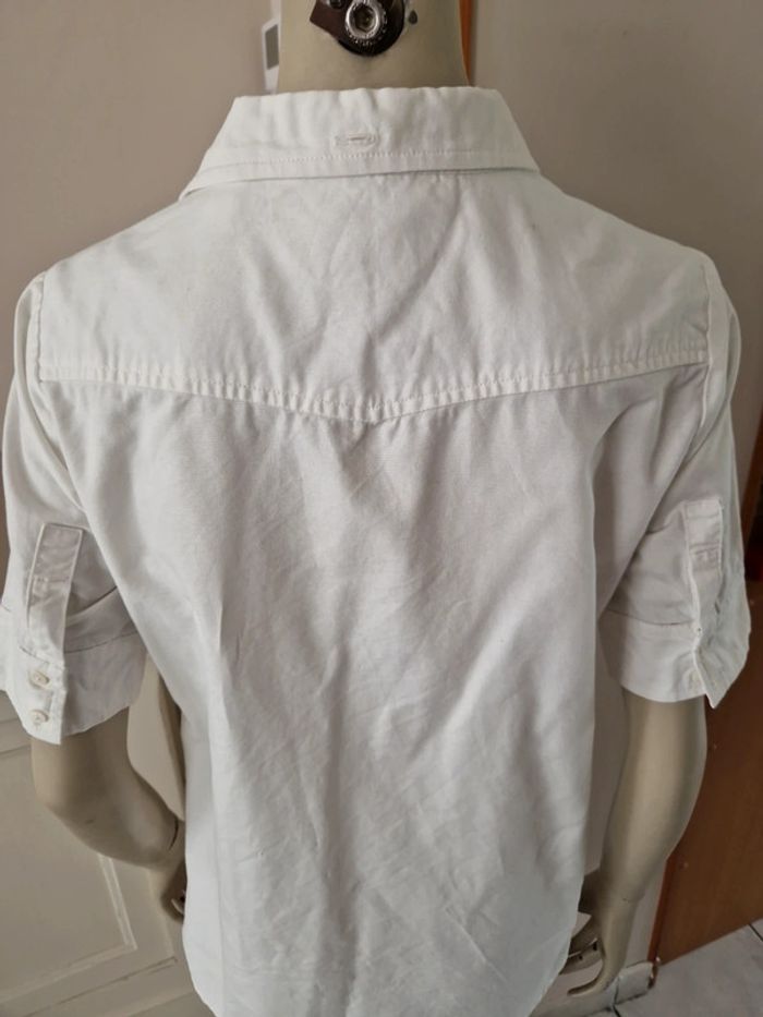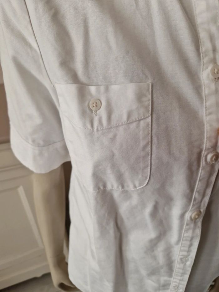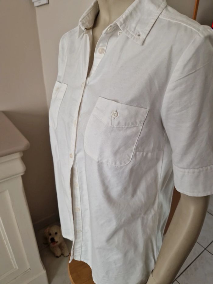 Jolie chemise blanche manches courtes avec deux boutons et un revers. . Une rangée de boutons du haut en bas ainsi qu'au deux pointes du col et derrière. Chemise coupe sport 100% coton. #ellaben_chemisefemme