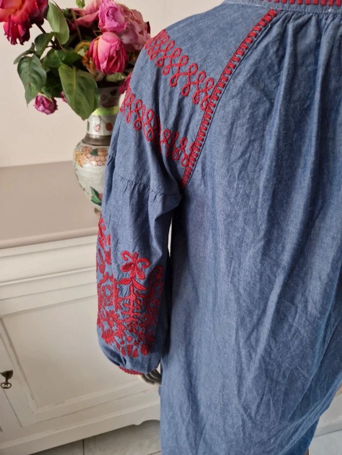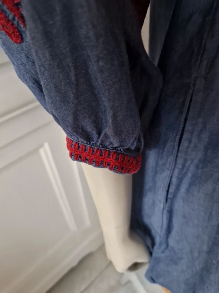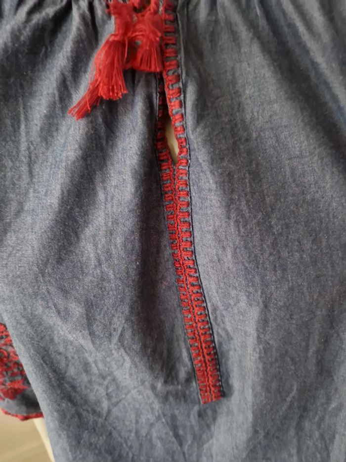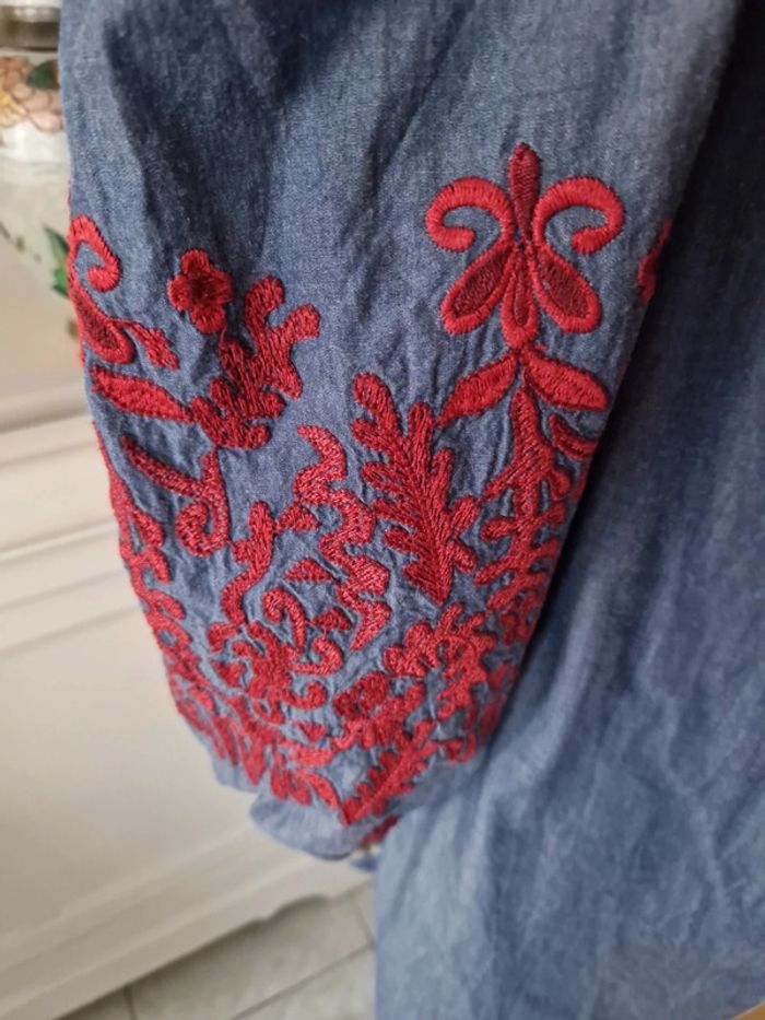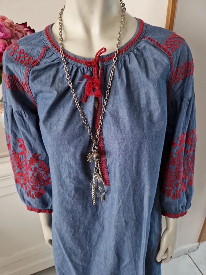 jolie robe ample avec de superbes broderies rouges sur les manches a l'encolure et au décolleté.